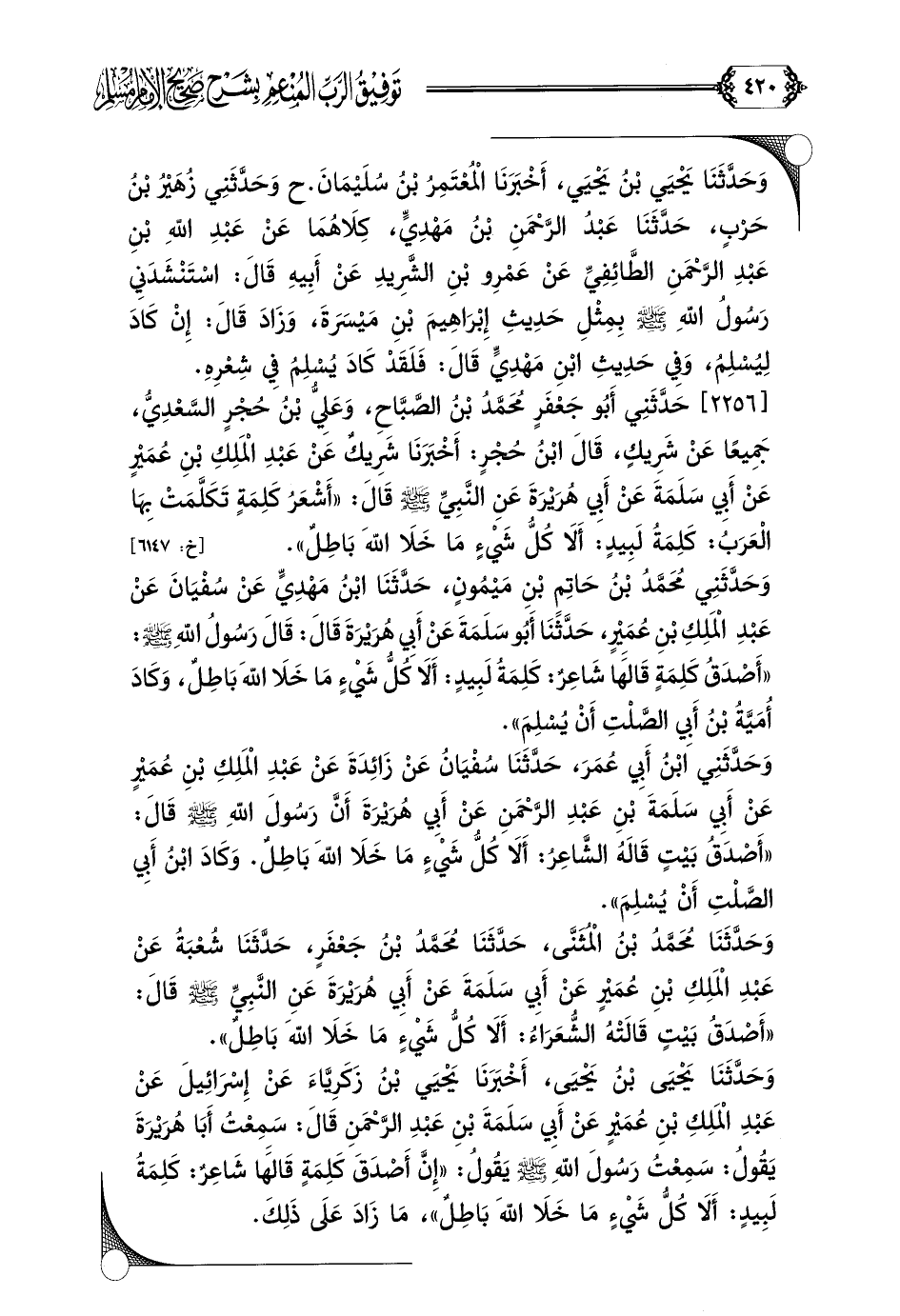 [٢٢٥٦] حَدَّثَنِي أَبُو جَعْفَرٍ مُحَمَّدُ بْنُ الصَّبَّاحِ، وَعَلِيُّ بْنُ حُجْرٍ السَّعْدِيُّ، جَمِيعًا عَنْ شَرِيكٍ، قَالَ ابْنُ حُجْرٍ: أَخْبَرَنَا شَرِيكٌ عَنْ عَبْدِ الْمَلِكِ بْنِ عُمَيْرٍ عَنْ أَبِي سَلَمَةَ عَنْ أَبِي هُرَيْرَةَ عَنِ النَّبِيِّ صلى الله عليه وسلم قَالَ: ((أَشْعَرُ كَلِمَةٍ تَكَلَّمَتْ بِهَا الْعَرَبُ: كَلِمَةُ لَبِيدٍ: أَلَا كُلُّ شَيْءٍ مَا خَلَا اللهَ بَاطِلٌ)).