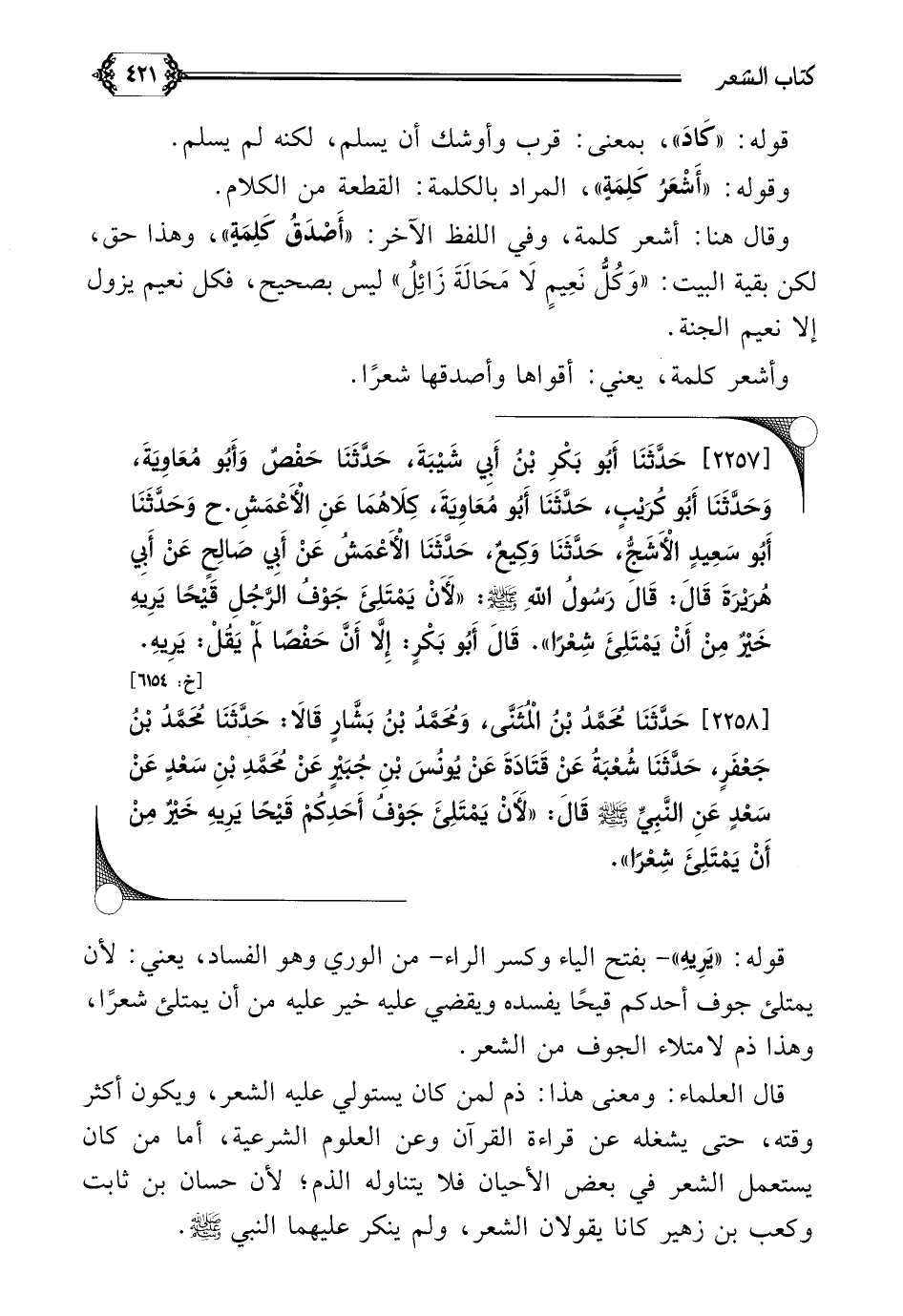 [٢٢٥٨] حَدَّثَنَا مُحَمَّدُ بْنُ الْمُثَنَّى، وَمُحَمَّدُ بْنُ بَشَّارٍ قَالَا: حَدَّثَنَا مُحَمَّدُ بْنُ جَعْفَرٍ، حَدَّثَنَا شُعْبَةُ عَنْ قَتَادَةَ عَنْ يُونُسَ بْنِ جُبَيْرٍ عَنْ مُحَمَّدِ بْنِ سَعْدٍ عَنْ سَعْدٍ عَنِ النَّبِيِّ صلى الله عليه وسلم قَالَ: ((لَأَنْ يَمْتَلِئَ جَوْفُ أَحَدِكُمْ قَيْحًا يَرِيهِ خَيْرٌ مِنْ أَنْ يَمْتَلِئَ شِعْرًا)).