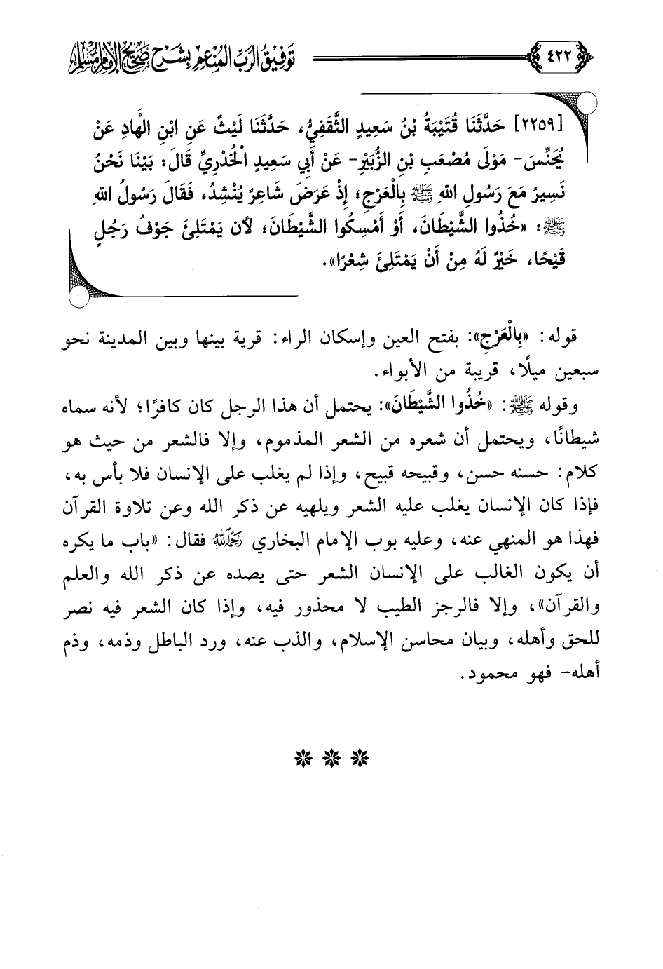 [٢٢٥٩] حَدَّثَنَا قُتَيْبَةُ بْنُ سَعِيدٍ الثَّقَفِيُّ، حَدَّثَنَا لَيْثٌ عَنِ ابْنِ الْهَادِ عَنْ يُحَنِّسَ- مَوْلَى مُصْعَبِ بْنِ الزُّبَيْرِ- عَنْ أَبِي سَعِيدٍ الْخُدْرِيِّ قَالَ: بَيْنَا نَحْنُ نَسِيرُ مَعَ رَسُولِ اللهِ صلى الله عليه وسلم بِالْعَرْجِ؛ إِذْ عَرَضَ شَاعِرٌ يُنْشِدُ، فَقَالَ رَسُولُ اللهِ صلى الله عليه وسلم: ((خُذُوا الشَّيْطَانَ، أَوْ أَمْسِكُوا الشَّيْطَانَ؛ لأن يَمْتَلِئَ جَوْفُ رَجُلٍ قَيْحًا، خَيْرٌ لَهُ مِنْ أَنْ يَمْتَلِئَ شِعْرًا)).