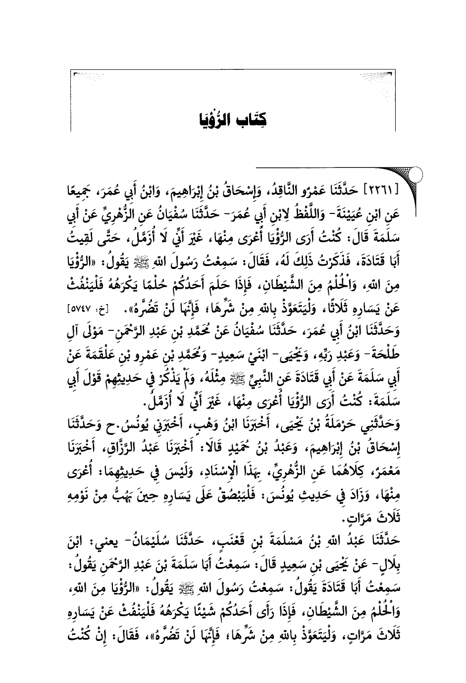 [٢٢٦١] حَدَّثَنَا عَمْرٌو النَّاقِدُ، وَإِسْحَاقُ بْنُ إِبْرَاهِيمَ، وَابْنُ أَبِي عُمَرَ، جَمِيعًا عَنِ ابْنِ عُيَيْنَةَ- وَاللَّفْظُ لِابْنِ أَبِي عُمَرَ- حَدَّثَنَا سُفْيَانُ عَنِ الزُّهْرِيِّ عَنْ أَبِي سَلَمَةَ قَالَ: كُنْتُ أَرَى الرُّؤْيَا أُعْرَى مِنْهَا، غَيْرَ أَنِّي لَا أُزَمَّلُ، حَتَّى لَقِيتُ أَبَا قَتَادَةَ، فَذَكَرْتُ ذَلِكَ لَهُ، فَقَالَ: سَمِعْتُ رَسُولَ اللَّهِ صلى الله عليه وسلم يَقُولُ: ((الرُّؤْيَا مِنَ اللَّهِ، وَالْحُلْمُ مِنَ الشَّيْطَانِ، فَإِذَا حَلَمَ أَحَدُكُمْ حُلْمًا يَكْرَهُهُ فَلْيَنْفُثْ عَنْ يَسَارِهِ ثَلَاثًا، وَلْيَتَعَوَّذْ بِاللَّهِ مِنْ شَرِّهَا؛ فَإِنَّهَا لَنْ تَضُرَّهُ)).