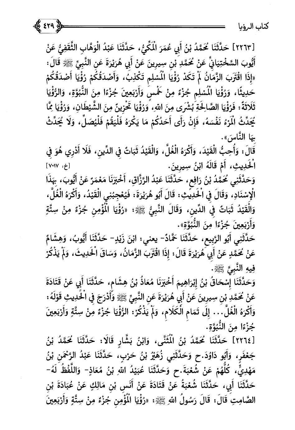 [٢٢٦٣] حَدَّثَنَا مُحَمَّدُ بْنُ أَبِي عُمَرَ الْمَكِّيُّ، حَدَّثَنَا عَبْدُ الْوَهَّابِ الثَّقَفِيُّ عَنْ أَيُّوبَ السَّخْتِيَانِيِّ عَنْ مُحَمَّدِ بْنِ سِيرِينَ عَنْ أَبِي هُرَيْرَةَ عَنِ النَّبِيِّ صلى الله عليه وسلم قَالَ: ((إِذَا اقْتَرَبَ الزَّمَانُ لَمْ تَكَدْ رُؤْيَا الْمُسْلِمِ تَكْذِبُ، وَأَصْدَقُكُمْ رُؤْيَا أَصْدَقُكُمْ حَدِيثًا، وَرُؤْيَا الْمُسْلِمِ جُزْءٌ مِنْ خَمْسٍ وَأَرْبَعِينَ جُزْءًا مِنَ النُّبُوَّةِ، وَالرُّؤْيَا ثَلَاثَةٌ: فَرُؤْيَا الصَّالِحَةِ بُشْرَى مِنَ اللَّهِ، وَرُؤْيَا تَحْزِينٌ مِنَ الشَّيْطَانِ، وَرُؤْيَا مِمَّا يُحَدِّثُ الْمَرْءُ نَفْسَهُ، فَإِنْ رَأَى أَحَدُكُمْ مَا يَكْرَهُ فَلْيَقُمْ فَلْيُصَلِّ، وَلَا يُحَدِّثْ بِهَا النَّاسَ)).