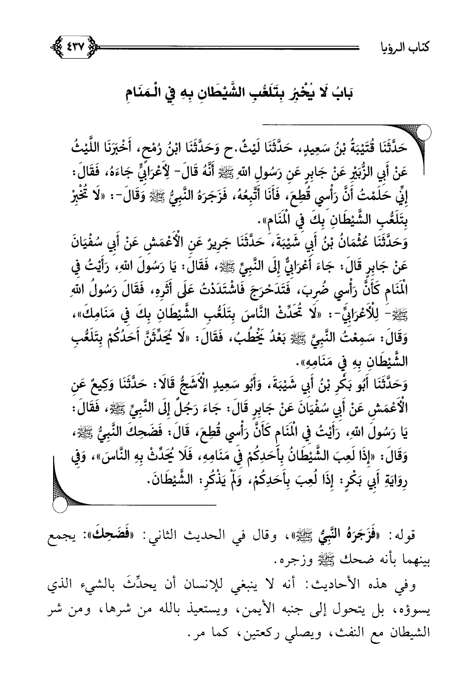 حَدَّثَنَا قُتَيْبَةُ بْنُ سَعِيدٍ، حَدَّثَنَا لَيْثٌ. ح وَحَدَّثَنَا ابْنُ رُمْحٍ، أَخْبَرَنَا اللَّيْثُ عَنْ أَبِي الزُّبَيْرِ عَنْ جَابِرٍ عَنِ رَسُولِ اللَّهِ صلى الله عليه وسلم أَنَّهُ قَالَ- لِأَعْرَابِيٍّ جَاءَهُ، فَقَالَ: إِنِّي حَلَمْتُ أَنَّ رَأْسِي قُطِعَ، فَأَنَا أَتَّبِعُهُ، فَزَجَرَهُ النَّبِيُّ صلى الله عليه وسلم وَقَالَ-: ((لَا تُخْبِرْ بِتَلَعُّبِ الشَّيْطَانِ بِكَ فِي الْمَنَامِ)).