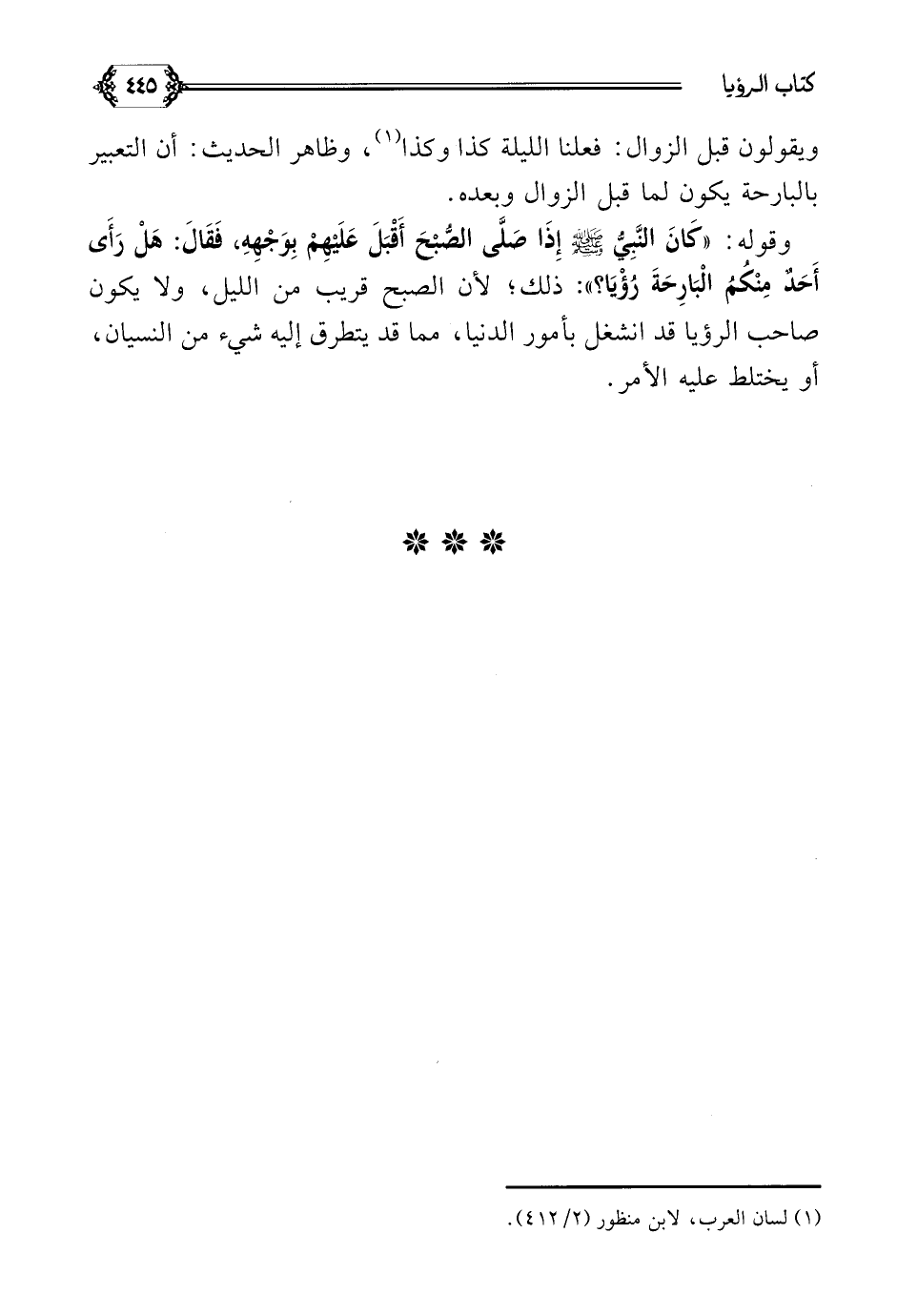 وقوله: ((كَانَ النَّبِيُّ صلى الله عليه وسلم إِذَا صَلَّى الصُّبْحَ أَقْبَلَ عَلَيْهِمْ بِوَجْهِهِ، فَقَالَ: هَلْ رَأَى أَحَدٌ مِنْكُمُ الْبَارِحَةَ رُؤْيَا؟ )): ذلك؛ لأن الصبح قريب من الليل، ولا يكون صاحب الرؤيا قد انشغل بأمور الدنيا، مما قد يتطرق إليه شيء من النسيان، أو يختلط عليه الأمر.