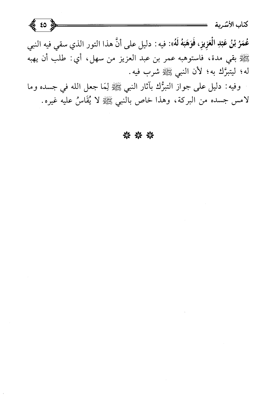 عُمَرُ بْنُ عَبْدِ الْعَزِيزِ، فَوَهَبَهُ لَهُ)): فيه: دليل على أنَّ هذا التور الذي سقي فيه النبي صلى الله عليه وسلم بقي مدة، فاستوهبه عمر بن عبد العزيز من سهل، أي: طلب أن يهبه له؛ ليتبرَّك به؛ لأن النبي صلى الله عليه وسلم شرب فيه.
