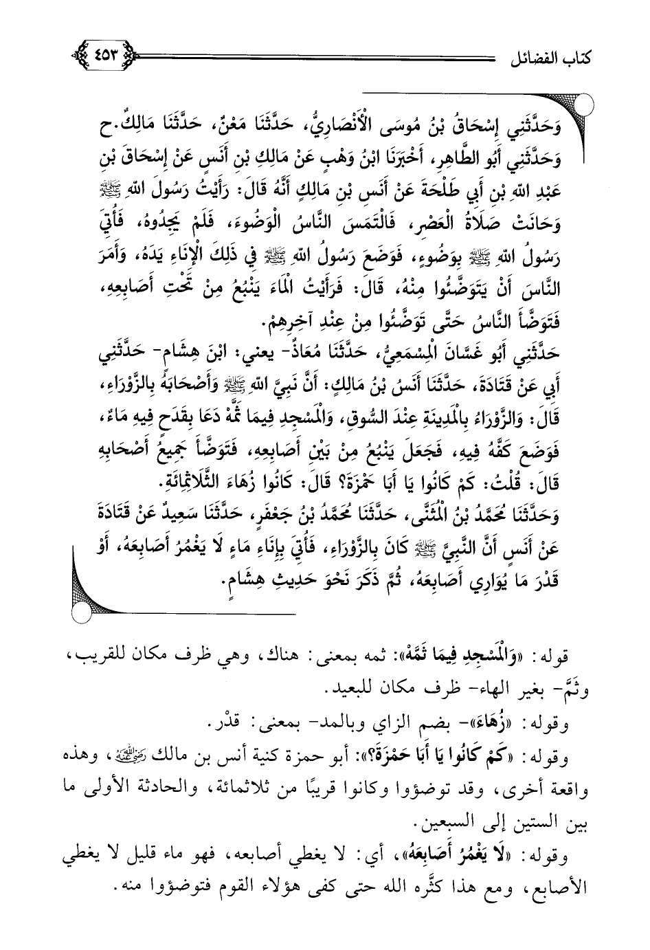حَدَّثَنِي أَبُو غَسَّانَ الْمِسْمَعِيُّ، حَدَّثَنَا مُعَاذٌ- يعني: ابْنَ هِشَامٍ- حَدَّثَنِي أَبِي عَنْ قَتَادَةَ، حَدَّثَنَا أَنَسُ بْنُ مَالِكٍ: أَنَّ نَبِيَّ اللَّهِ صلى الله عليه وسلم وَأَصْحَابَهُ بِالزَّوْرَاءِ، قَالَ: وَالزَّوْرَاءُ بِالْمَدِينَةِ عِنْدَ السُّوقِ، وَالْمَسْجِدِ فِيمَا ثَمَّهْ دَعَا بِقَدَحٍ فِيهِ مَاءٌ، فَوَضَعَ كَفَّهُ فِيهِ، فَجَعَلَ يَنْبُعُ مِنْ بَيْنِ أَصَابِعِهِ، فَتَوَضَّأَ جَمِيعُ أَصْحَابِهِ قَالَ: قُلْتُ: كَمْ كَانُوا يَا أَبَا حَمْزَةَ؟ قَالَ: كَانُوا زُهَاءَ الثَّلَاثِمِائَةِ.