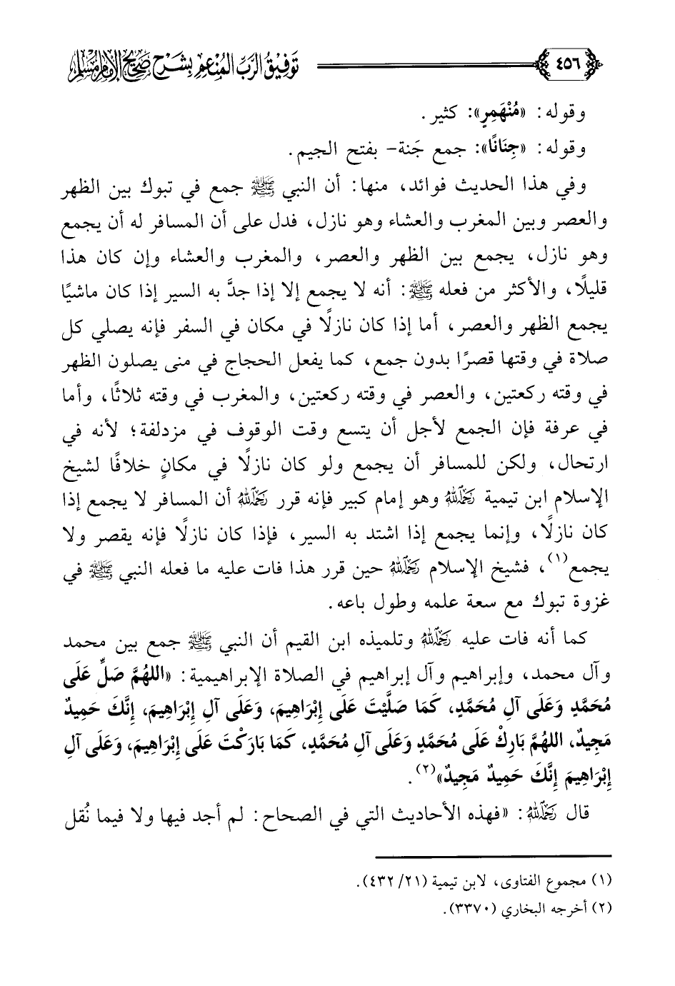 وهذا الحديث فيه فوائد، منها: أن النبي صلى الله عليه وسلم جمع في تبوك بين الظهر والعصر وبين المغرب والعشاء وهو نازل، فدل على أن المسافر له أن يجمع وهو نازل، يجمع بين الظهر والعصر، والمغرب والعشاء وإن كان هذا قليلًا، والأكثر من فعله صلى الله عليه وسلم: أنه لا يجمع إلا إذا جدَّ به السير إذا كان ماشيًا يجمع الظهر والعصر، أما إذا كان نازلًا في مكان في السفر فإنه يصلي كل صلاة في وقتها قصرًا بدون جمع، كما يفعل الحجاج في منى يصلون الظهر في وقته ركعتين، والعصر في وقته ركعتين، والمغرب في وقته ثلاثًا، وأما في عرفة فإن الجمع لأجل أن يتسع وقت الوقوف في مزدلفة؛ لأنه في ارتحال، ولكن للمسافر أن يجمع ولو كان نازلًا في مكانٍ خلافًا لشيخ الإسلام ابن تيمية رحمه الله وهو إمام كبير فإنه قرر رحمه الله أن المسافر لا يجمع إذا كان نازلًا، وإنما يجمع إذا اشتد به السير، فإذا كان نازلًا فإنه يقصر ولا يجمع (¬١)، فشيخ الإسلام رحمه الله حين قرر هذا فات عليه ما فعله النبي صلى الله عليه وسلم في غزوة تبوك مع سعة علمه وطول باعه.