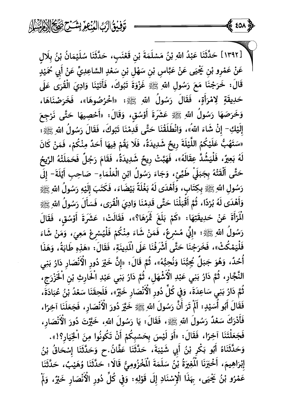 [١٣٩٢] حَدَّثَنَا عَبْدُ اللَّهِ بْنُ مَسْلَمَةَ بْنِ قَعْنَبٍ، حَدَّثَنَا سُلَيْمَانُ بْنُ بِلَالٍ عَنْ عَمْرِو بْنِ يَحْيَى عَنْ عَبَّاسِ بْنِ سَهْلِ بْنِ سَعْدٍ السَّاعِدِيِّ عَنْ أَبِي حُمَيْدٍ قَالَ: خَرَجْنَا مَعَ رَسُولِ اللَّهِ صلى الله عليه وسلم غَزْوَةَ تَبُوكَ، فَأَتَيْنَا وَادِيَ الْقُرَى عَلَى حَدِيقَةٍ لِامْرَأَةٍ، فَقَالَ رَسُولُ اللَّهِ صلى الله عليه وسلم: ((اخْرُصُوهَا))، فَخَرَصْنَاهَا، وَخَرَصَهَا رَسُولُ اللَّهِ صلى الله عليه وسلم عَشَرَةَ أَوْسُقٍ، وَقَالَ: ((أَحْصِيهَا حَتَّى نَرْجِعَ إِلَيْكِ- إِنْ شَاءَ اللَّهُ))، وَانْطَلَقْنَا حَتَّى قَدِمْنَا تَبُوكَ، فَقَالَ رَسُولُ اللَّهِ صلى الله عليه وسلم: ((سَتَهُبُّ عَلَيْكُمُ اللَّيْلَةَ رِيحٌ شَدِيدَةٌ، فَلَا يَقُمْ فِيهَا أَحَدٌ مِنْكُمْ، فَمَنْ كَانَ لَهُ بَعِيرٌ، فَلْيَشُدَّ عِقَالَهُ))، فَهَبَّتْ رِيحٌ شَدِيدَةٌ، فَقَامَ رَجُلٌ فَحَمَلَتْهُ الرِّيحُ حَتَّى أَلْقَتْهُ بِجَبَلَيْ طَيِّئٍ، وَجَاءَ رَسُولُ ابْنِ الْعَلْمَاءِ- صَاحِبِ أَيْلَةَ- إِلَى رَسُولِ اللَّهِ صلى الله عليه وسلم بِكِتَابٍ، وَأَهْدَى لَهُ بَغْلَةً بَيْضَاءَ، فَكَتَبَ إِلَيْهِ رَسُولُ اللَّهِ صلى الله عليه وسلم وَأَهْدَى لَهُ بُرْدًا، ثُمَّ أَقْبَلْنَا حَتَّى قَدِمْنَا وَادِيَ الْقُرَى، فَسَأَلَ رَسُولُ اللَّهِ صلى الله عليه وسلم الْمَرْأَةَ عَنْ حَدِيقَتِهَا: ((كَمْ بَلَغَ ثَمَرُهَا؟ ))، فَقَالَتْ: عَشَرَةَ أَوْسُقٍ، فَقَالَ رَسُولُ اللَّهِ صلى الله عليه وسلم: ((إِنِّي مُسْرِعٌ، فَمَنْ شَاءَ مِنْكُمْ فَلْيُسْرِعْ مَعِيَ، وَمَنْ شَاءَ