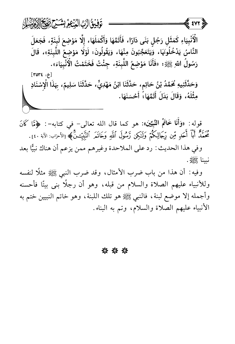 الْأَنْبِيَاءِ كَمَثَلِ رَجُلٍ بَنَى دَارًا، فَأَتَمَّهَا وَأَكْمَلَهَا، إِلَّا مَوْضِعَ لَبِنَةٍ، فَجَعَلَ النَّاسُ يَدْخُلُونَهَا، وَيَتَعَجَّبُونَ مِنْهَا، وَيَقُولُونَ: لَوْلَا مَوْضِعُ اللَّبِنَةِ))، قَالَ رَسُولُ اللَّهِ صلى الله عليه وسلم: ((فَأَنَا مَوْضِعُ اللَّبِنَةِ، جِئْتُ فَخَتَمْتُ الْأَنْبِيَاءَ)).