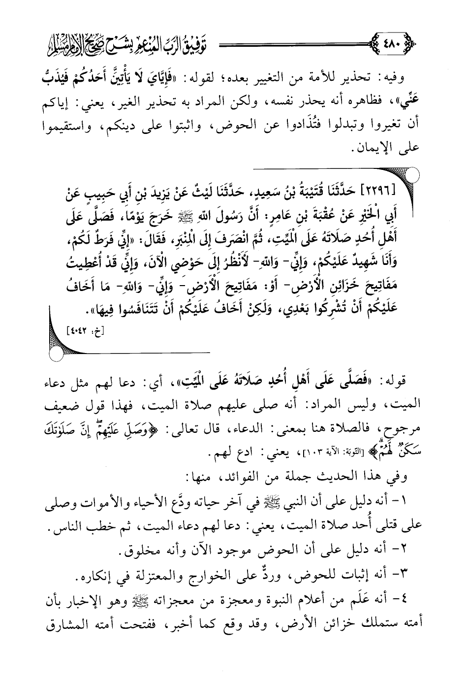 [٢٢٩٦] حَدَّثَنَا قُتَيْبَةُ بْنُ سَعِيدٍ، حَدَّثَنَا لَيْثٌ عَنْ يَزِيدَ بْنِ أَبِي حَبِيبٍ عَنْ أَبِي الْخَيْرِ عَنْ عُقْبَةَ بْنِ عَامِرٍ: أَنَّ رَسُولَ اللَّهِ صلى الله عليه وسلم خَرَجَ يَوْمًا، فَصَلَّى عَلَى أَهْلِ أُحُدٍ صَلَاتَهُ عَلَى الْمَيِّتِ، ثُمَّ انْصَرَفَ إِلَى الْمِنْبَرِ، فَقَالَ: ((إِنِّي فَرَطٌ لَكُمْ، وَأَنَا شَهِيدٌ عَلَيْكُمْ، وَإِنِّي- وَاللَّهِ- لَأَنْظُرُ إِلَى حَوْضِي الْآنَ، وَإِنِّي قَدْ أُعْطِيتُ مَفَاتِيحَ خَزَائِنِ الْأَرْضِ- أَوْ: مَفَاتِيحَ الْأَرْضِ- وَإِنِّي- وَاللَّهِ- مَا أَخَافُ عَلَيْكُمْ أَنْ تُشْرِكُوا بَعْدِي، وَلَكِنْ أَخَافُ عَلَيْكُمْ أَنْ تَتَنَافَسُوا فِيهَا)).
