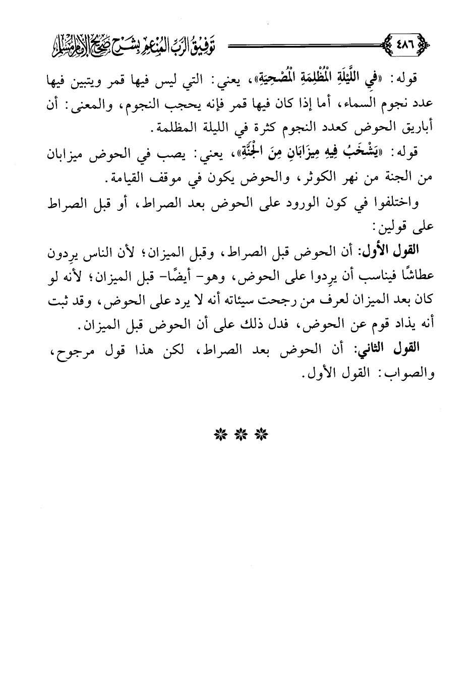 القول الأول: أن الحوض قبل الصراط، وقبل الميزان؛ لأن الناس يرِدون عطاشًا فيناسب أن يرِدوا على الحوض، وهو- أيضًا- قبل الميزان، لأنه لو كان بعد الميزان لعرف من رجحت سيئاته أنه لا يرد على الحوض، وقد ثبت أنه يذاد قوم عن الحوض، فدل ذلك على أن الحوض قبل الميزان.