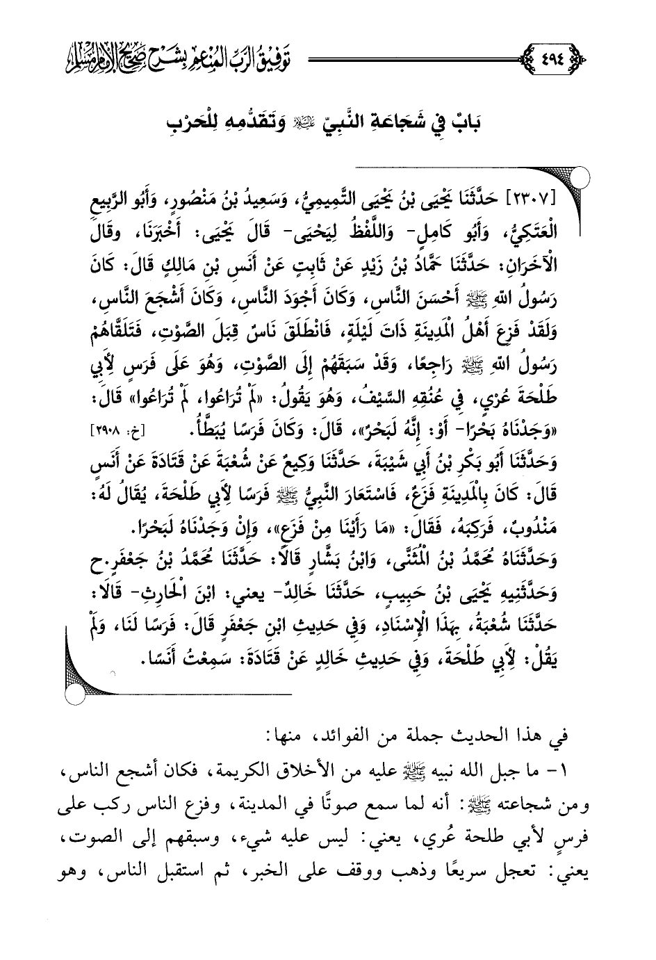 [٢٣٠٧] حَدَّثَنَا يَحْيَى بْنُ يَحْيَى التَّمِيمِيُّ، وَسَعِيدُ بْنُ مَنْصُورٍ، وَأَبُو الرَّبِيعِ الْعَتَكِيُّ، وَأَبُو كَامِلٍ- وَاللَّفْظُ لِيَحْيَى- قَالَ يَحْيَى: أَخْبَرَنَا، وقَالَ الْآخَرَانِ: حَدَّثَنَا حَمَّادُ بْنُ زَيْدٍ عَنْ ثَابِتٍ عَنْ أَنَسِ بْنِ مَالِكٍ قَالَ: كَانَ رَسُولُ اللَّهِ صلى الله عليه وسلم أَحْسَنَ النَّاسِ، وَكَانَ أَجْوَدَ النَّاسِ، وَكَانَ أَشْجَعَ النَّاسِ، وَلَقَدْ فَزِعَ أَهْلُ الْمَدِينَةِ ذَاتَ لَيْلَةٍ، فَانْطَلَقَ نَاسٌ قِبَلَ الصَّوْتِ، فَتَلَقَّاهُمْ رَسُولُ اللَّهِ صلى الله عليه وسلم رَاجِعًا، وَقَدْ سَبَقَهُمْ إِلَى الصَّوْتِ، وَهُوَ عَلَى فَرَسٍ لِأَبِي طَلْحَةَ عُرْيٍ، فِي عُنُقِهِ السَّيْفُ، وَهُوَ يَقُولُ: ((لَمْ تُرَاعُوا، لَمْ تُرَاعُوا)) قَالَ: ((وَجَدْنَاهُ بَحْرًا- أَوْ: إِنَّهُ لَبَحْرٌ))، قَالَ: وَكَانَ فَرَسًا يُبَطَّأُ.