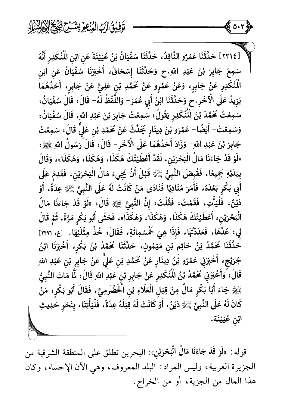 [٢٣١٤] حَدَّثَنَا عَمْرٌو النَّاقِدُ، حَدَّثَنَا سُفْيَانُ بْنُ عُيَيْنَةَ عَنِ ابْنِ الْمُنْكَدِرِ أَنَّهُ سَمِعَ جَابِرَ بْنَ عَبْدِ اللَّهِ. ح وَحَدَّثَنَا إِسْحَاقُ، أَخْبَرَنَا سُفْيَانُ عَنِ ابْنِ الْمُنْكَدِرِ عَنْ جَابِرٍ، وَعَنْ عَمْرٍو عَنْ مُحَمَّدِ بْنِ عَلِيٍّ عَنْ جَابِرٍ، أَحَدُهُمَا يَزِيدُ عَلَى الْآخَرِ. ح وَحَدَّثَنَا ابْنُ أَبِي عُمَرَ- وَاللَّفْظُ لَهُ- قَالَ: قَالَ سُفْيَانُ: سَمِعْتُ مُحَمَّدَ بْنَ الْمُنْكَدِرِ يَقُولُ: سَمِعْتُ جَابِرَ بْنَ عَبْدِ اللَّهِ، قَالَ سُفْيَانُ: وَسَمِعْتُ- أَيْضًا- عَمْرَو بْنَ دِينَارٍ يُحَدِّثُ عَنْ مُحَمَّدِ بْنِ عَلِيٍّ قَالَ: سَمِعْتُ جَابِرَ بْنَ عَبْدِ اللَّهِ- وَزَادَ أَحَدُهُمَا عَلَى الْآخَرِ- قَالَ: قَالَ رَسُولُ اللَّهِ صلى الله عليه وسلم: ((لَوْ قَدْ جَاءَنَا مَالُ الْبَحْرَيْنِ، لَقَدْ أَعْطَيْتُكَ هَكَذَا، وَهَكَذَا، وَهَكَذَا))، وَقَالَ بِيَدَيْهِ جَمِيعًا، فَقُبِضَ النَّبِيُّ صلى الله عليه وسلم قَبْلَ أَنْ يَجِيءَ مَالُ الْبَحْرَيْنِ، فَقَدِمَ عَلَى أَبِي بَكْرٍ بَعْدَهُ، فَأَمَرَ مُنَادِيًا فَنَادَى مَنْ كَانَتْ لَهُ عَلَى النَّبِيِّ صلى الله عليه وسلم عِدَةٌ، أَوْ دَيْنٌ، فَلْيَأْتِ، فَقُمْتُ: فَقُلْتُ: إِنَّ النَّبِيَّ صلى الله عليه وسلم قَالَ: ((لَوْ قَدْ جَاءَنَا مَالُ الْبَحْرَيْنِ، أَعْطَيْتُكَ هَكَذَا، وَهَكَذَا، وَهَكَذَا))، فَحَثَى أَبُو بَكْرٍ مَرَّةً، ثُمَّ قَالَ لِي: عُدَّهَا، فَعَدَدْتُهَا، فَإِذَا هِيَ خَمْسُمِائَةٍ، فَقَالَ: خُذْ مِثْلَيْهَا.