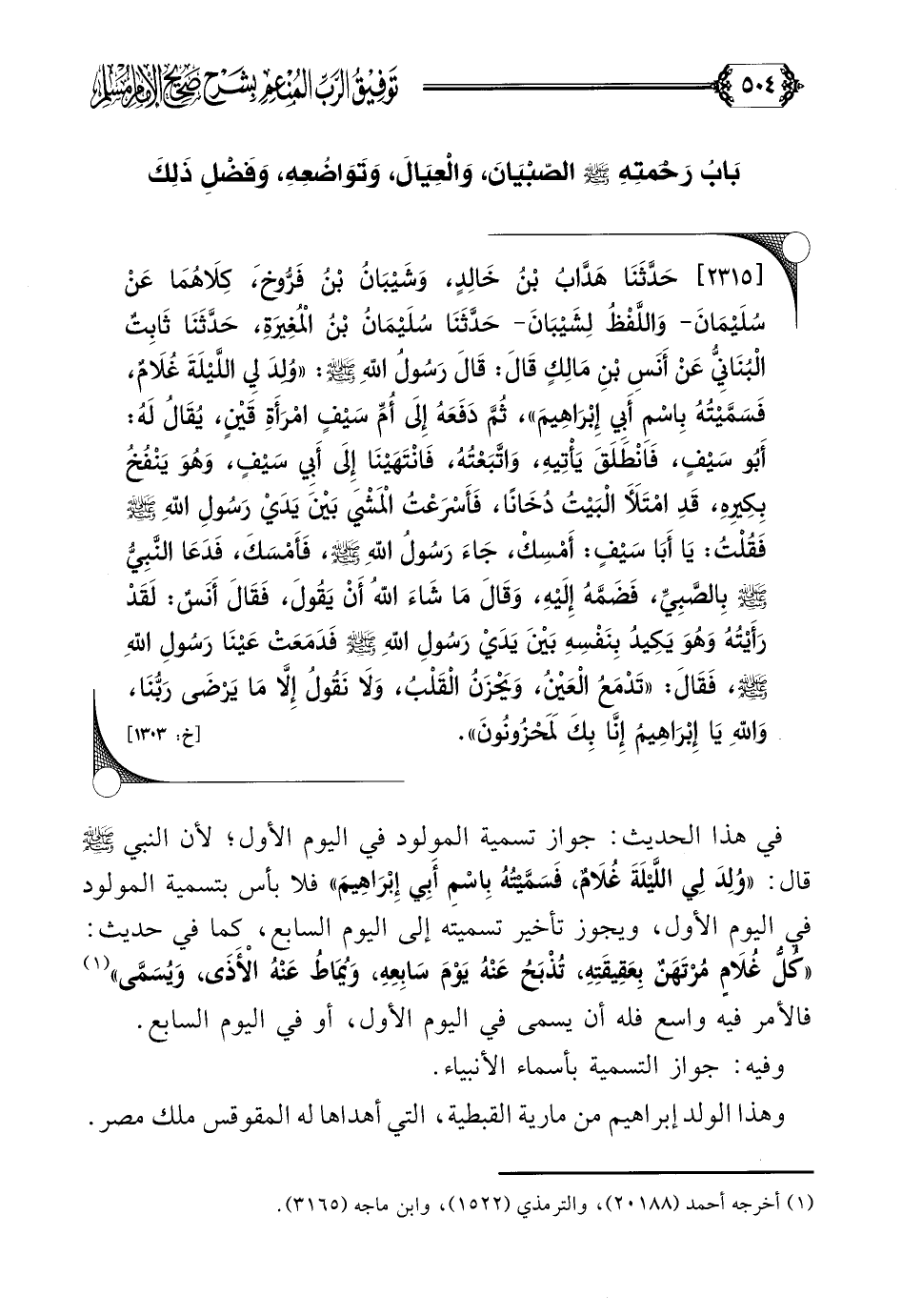 [٢٣١٥] حَدَّثَنَا هَدَّابُ بْنُ خَالِدٍ، وَشَيْبَانُ بْنُ فَرُّوخَ، كِلَاهُمَا عَنْ سُلَيْمَانَ- وَاللَّفْظُ لِشَيْبَانَ- حَدَّثَنَا سُلَيْمَانُ بْنُ الْمُغِيرَةِ، حَدَّثَنَا ثَابِتٌ الْبُنَانِيُّ عَنْ أَنَسِ بْنِ مَالِكٍ قَالَ: قَالَ رَسُولُ اللَّهِ صلى الله عليه وسلم: ((وُلِدَ لِي اللَّيْلَةَ غُلَامٌ، فَسَمَّيْتُهُ بِاسْمِ أَبِي إِبْرَاهِيمَ))، ثُمَّ دَفَعَهُ إِلَى أُمِّ سَيْفٍ امْرَأَةِ قَيْنٍ، يُقَالُ لَهُ: أَبُو سَيْفٍ، فَانْطَلَقَ يَأْتِيهِ، وَاتَّبَعْتُهُ، فَانْتَهَيْنَا إِلَى أَبِي سَيْفٍ، وَهُوَ يَنْفُخُ بِكِيرِهِ، قَدِ امْتَلَأَ الْبَيْتُ دُخَانًا، فَأَسْرَعْتُ الْمَشْيَ بَيْنَ يَدَيْ رَسُولِ اللَّهِ صلى الله عليه وسلم فَقُلْتُ: يَا أَبَا سَيْفٍ: أَمْسِكْ، جَاءَ رَسُولُ اللَّهِ صلى الله عليه وسلم، فَأَمْسَكَ، فَدَعَا النَّبِيُّ صلى الله عليه وسلم بِالصَّبِيِّ، فَضَمَّهُ إِلَيْهِ، وَقَالَ مَا شَاءَ اللَّهُ أَنْ يَقُولَ، فَقَالَ أَنَسٌ: لَقَدْ رَأَيْتُهُ وَهُوَ يَكِيدُ بِنَفْسِهِ بَيْنَ يَدَيْ رَسُولِ اللَّهِ صلى الله عليه وسلم فَدَمَعَتْ عَيْنَا رَسُولِ اللَّهِ صلى الله عليه وسلم، فَقَالَ: ((تَدْمَعُ الْعَيْنُ، وَيَحْزَنُ الْقَلْبُ، وَلَا نَقُولُ إِلَّا مَا يَرْضَى رَبُّنَا، وَاللَّهِ يَا إِبْرَاهِيمُ إِنَّا بِكَ لَمَحْزُونُونَ)).