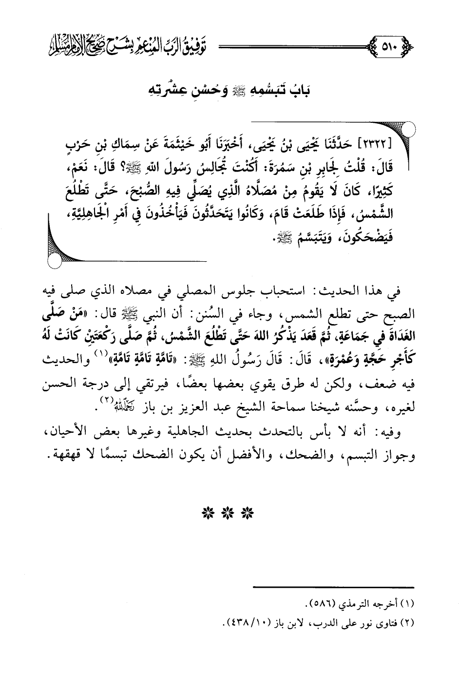 [٢٣٢٢] حَدَّثَنَا يَحْيَى بْنُ يَحْيَى، أَخْبَرَنَا أَبُو خَيْثَمَةَ عَنْ سِمَاكِ بْنِ حَرْبٍ قَالَ: قُلْتُ لِجَابِرِ بْنِ سَمُرَةَ: أَكُنْتَ تُجَالِسُ رَسُولَ اللَّهِ صلى الله عليه وسلم؟ قَالَ: نَعَمْ، كَثِيرًا، كَانَ لَا يَقُومُ مِنْ مُصَلَّاهُ الَّذِي يُصَلِّي فِيهِ الصُّبْحَ، حَتَّى تَطْلُعَ الشَّمْسُ، فَإِذَا طَلَعَتْ قَامَ، وَكَانُوا يَتَحَدَّثُونَ فَيَأْخُذُونَ فِي أَمْرِ الْجَاهِلِيَّةِ، فَيَضْحَكُونَ، وَيَتَبَسَّمُ صلى الله عليه وسلم.