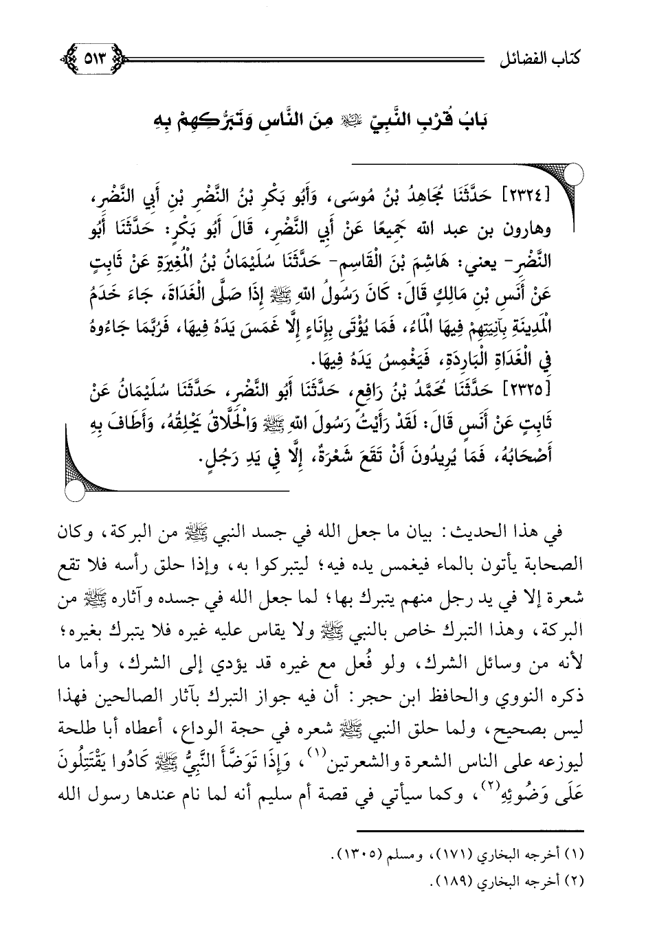 [٢٣٢٥] حَدَّثَنَا مُحَمَّدُ بْنُ رَافِعٍ، حَدَّثَنَا أَبُو النَّضْرِ، حَدَّثَنَا سُلَيْمَانُ عَنْ ثَابِتٍ عَنْ أَنَسٍ قَالَ: لَقَدْ رَأَيْتُ رَسُولَ اللَّهِ صلى الله عليه وسلم وَالْحَلَّاقُ يَحْلِقُهُ، وَأَطَافَ بِهِ أَصْحَابُهُ، فَمَا يُرِيدُونَ أَنْ تَقَعَ شَعْرَةٌ، إِلَّا فِي يَدِ رَجُلٍ.