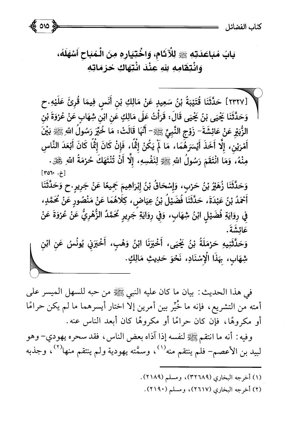 [٢٣٢٧] حَدَّثَنَا قُتَيْبَةُ بْنُ سَعِيدٍ عَنْ مَالِكِ بْنِ أَنَسٍ فِيمَا قُرِئَ عَلَيْهِ. ح وَحَدَّثَنَا يَحْيَى بْنُ يَحْيَى قَالَ: قَرَأْتُ عَلَى مَالِكٍ عَنِ ابْنِ شِهَابٍ عَنْ عُرْوَةَ بْنِ الزُّبَيْرِ عَنْ عَائِشَةَ- زَوْجِ النَّبِيِّ صلى الله عليه وسلم- أَنَّهَا قَالَتْ: مَا خُيِّرَ رَسُولُ اللَّهِ صلى الله عليه وسلم بَيْنَ أَمْرَيْنِ، إِلَّا أَخَذَ أَيْسَرَهُمَا، مَا لَمْ يَكُنْ إِثْمًا، فَإِنْ كَانَ إِثْمًا كَانَ أَبْعَدَ النَّاسِ مِنْهُ، وَمَا انْتَقَمَ رَسُولُ اللَّهِ صلى الله عليه وسلم لِنَفْسِهِ، إِلَّا أَنْ تُنْتَهَكَ حُرْمَةُ اللَّهِ عز وجل.