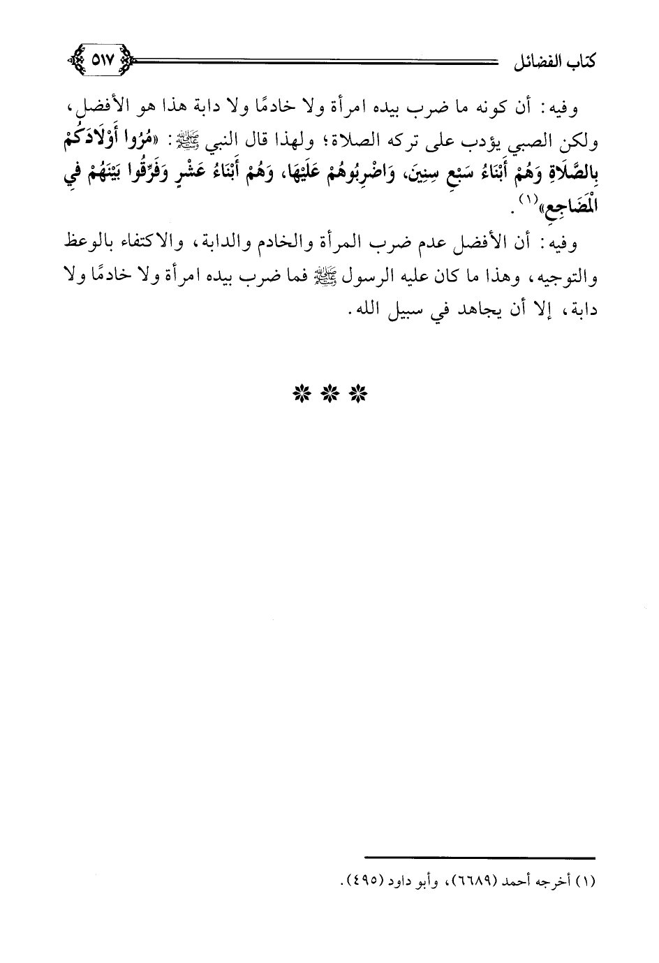 وفيه: أن كونه ما ضرب بيده امرأة ولا خادمًا ولا دابة هذا هو الأفضل، ولكن الصبي يؤدب على تركه الصلاة؛ ولهذا قال النبي صلى الله عليه وسلم: ((مُرُوا أَوْلَادَكُمْ بِالصَّلَاةِ وَهُمْ أَبْنَاءُ سَبْعِ سِنِينَ، وَاضْرِبُوهُمْ عَلَيْهَا، وَهُمْ أَبْنَاءُ عَشْرٍ وَفَرِّقُوا بَيْنَهُمْ فِي الْمَضَاجِعِ)) (¬١).