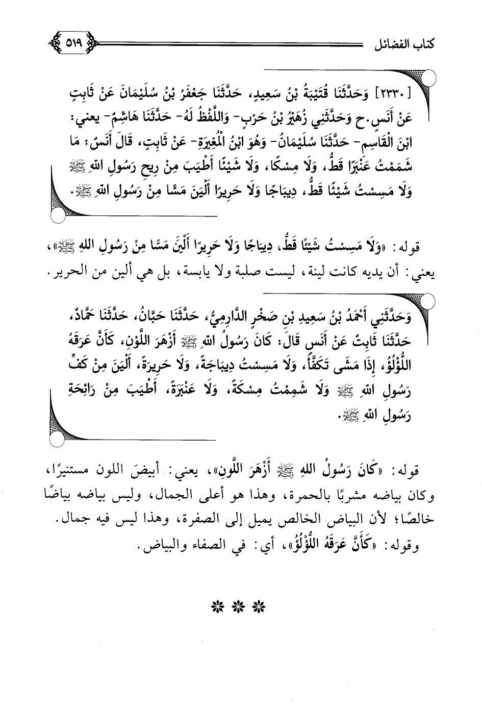[٢٣٣٠] وَحَدَّثَنَا قُتَيْبَةُ بْنُ سَعِيدٍ، حَدَّثَنَا جَعْفَرُ بْنُ سُلَيْمَانَ عَنْ ثَابِتٍ عَنْ أَنَسٍ. ح وَحَدَّثَنِي زُهَيْرُ بْنُ حَرْبٍ- وَاللَّفْظُ لَهُ- حَدَّثَنَا هَاشِمٌ- يعني: ابْنَ الْقَاسِمِ- حَدَّثَنَا سُلَيْمَانُ- وَهُوَ ابْنُ الْمُغِيرَةِ- عَنْ ثَابِتٍ، قَالَ أَنَسٌ: مَا شَمَمْتُ عَنْبَرًا قَطُّ، وَلَا مِسْكًا، وَلَا شَيْئًا أَطْيَبَ مِنْ رِيحِ رَسُولِ اللَّهِ صلى الله عليه وسلم وَلَا مَسِسْتُ شَيْئًا قَطُّ، دِيبَاجًا وَلَا حَرِيرًا أَلْيَنَ مَسًّا مِنْ رَسُولِ اللَّهِ صلى الله عليه وسلم.