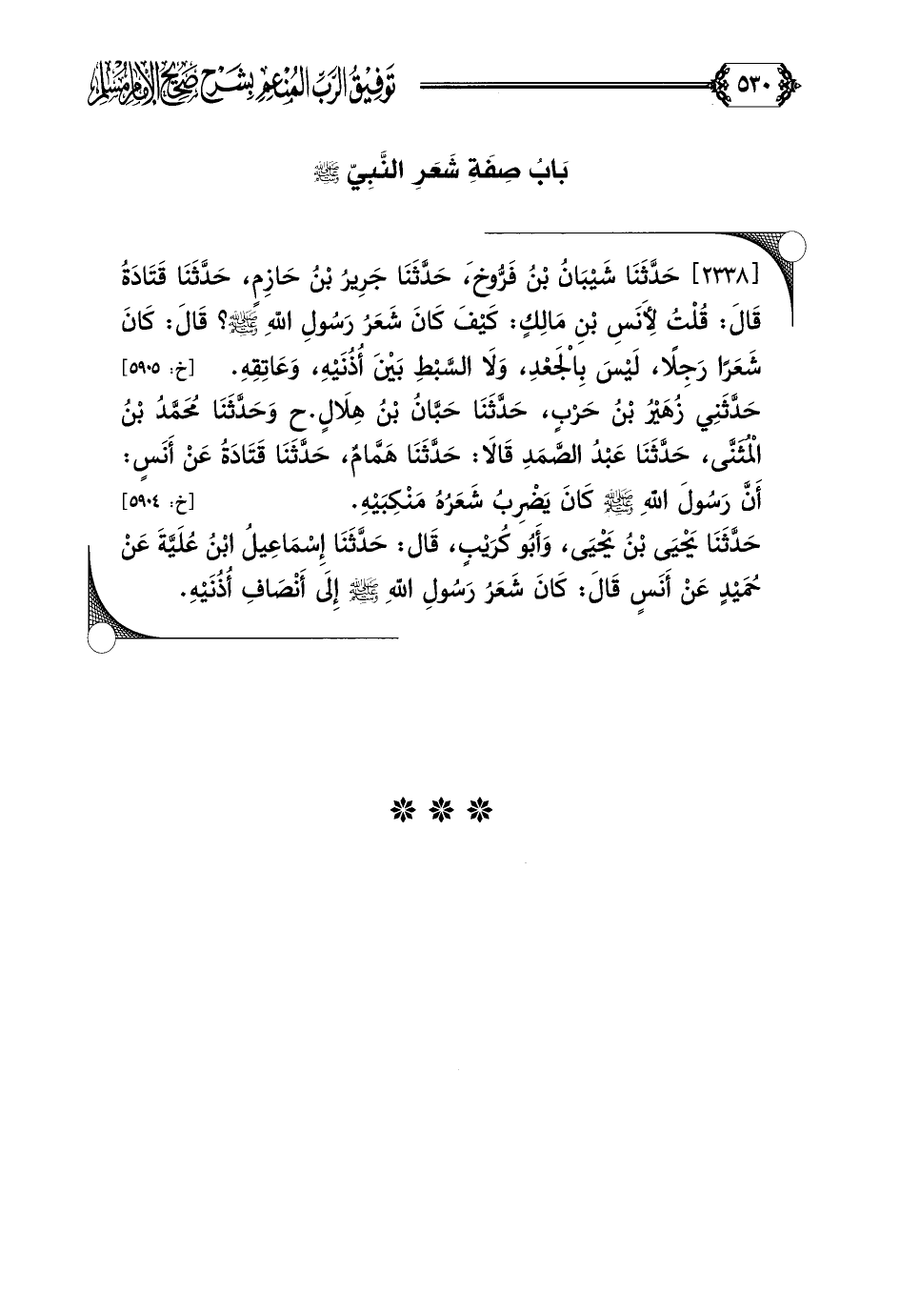 [٢٣٣٨] حَدَّثَنَا شَيْبَانُ بْنُ فَرُّوخَ، حَدَّثَنَا جَرِيرُ بْنُ حَازِمٍ، حَدَّثَنَا قَتَادَةُ قَالَ: قُلْتُ لِأَنَسِ بْنِ مَالِكٍ: كَيْفَ كَانَ شَعَرُ رَسُولِ اللَّهِ صلى الله عليه وسلم؟ قَالَ: كَانَ شَعَرًا رَجِلًا، لَيْسَ بِالْجَعْدِ، وَلَا السَّبْطِ بَيْنَ أُذُنَيْهِ، وَعَاتِقِهِ.