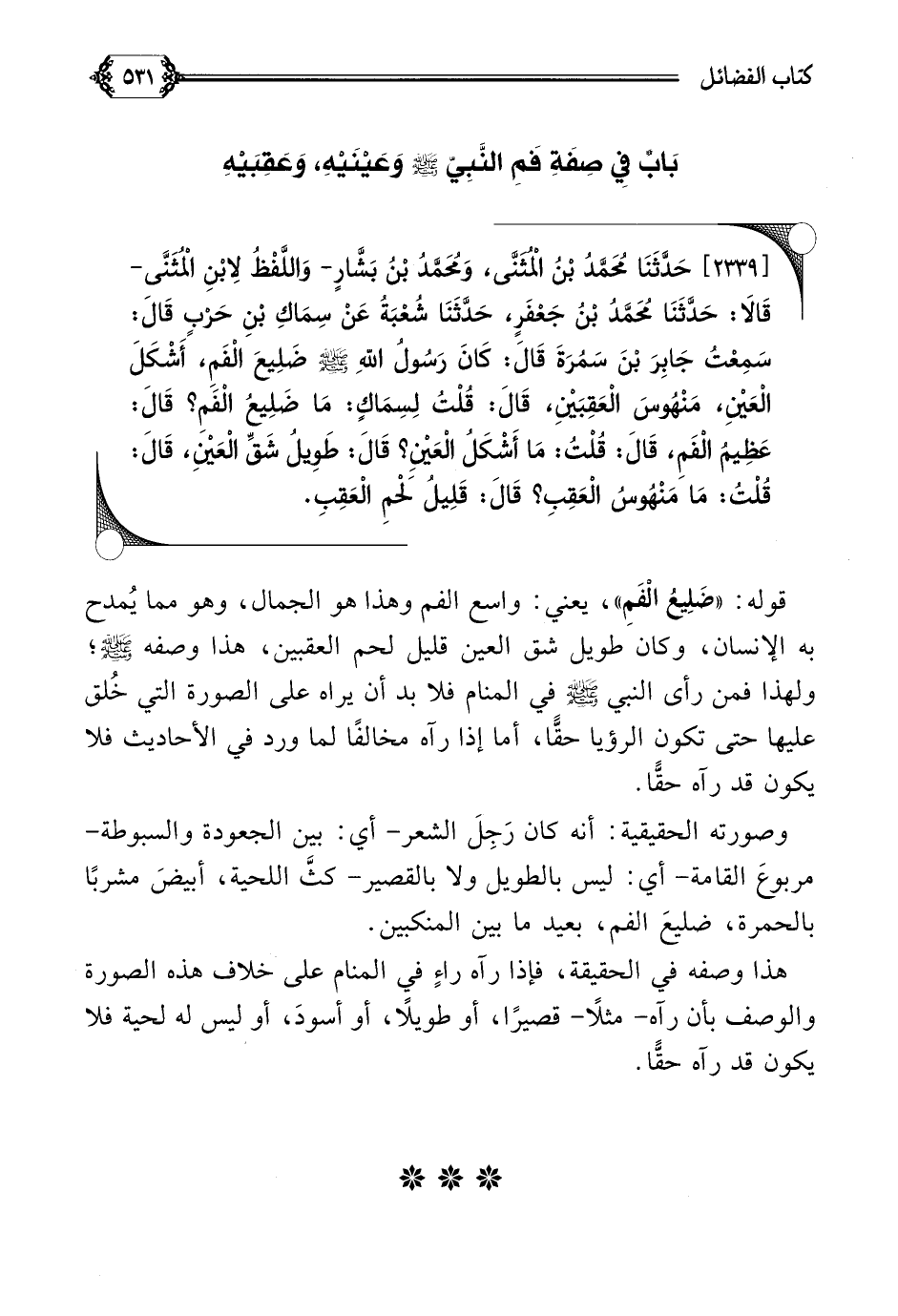 [٢٣٣٩] حَدَّثَنَا مُحَمَّدُ بْنُ الْمُثَنَّى، وَمُحَمَّدُ بْنُ بَشَّارٍ- وَاللَّفْظُ لِابْنِ الْمُثَنَّى- قَالَا: حَدَّثَنَا مُحَمَّدُ بْنُ جَعْفَرٍ، حَدَّثَنَا شُعْبَةُ عَنْ سِمَاكِ بْنِ حَرْبٍ قَالَ: سَمِعْتُ جَابِرَ بْنَ سَمُرَةَ قَالَ: كَانَ رَسُولُ اللَّهِ صلى الله عليه وسلم ضَلِيعَ الْفَمِ، أَشْكَلَ الْعَيْنِ، مَنْهُوسَ الْعَقِبَيْنِ، قَالَ: قُلْتُ لِسِمَاكٍ: مَا ضَلِيعُ الْفَمِ؟ قَالَ: عَظِيمُ الْفَمِ، قَالَ: قُلْتُ: مَا أَشْكَلُ الْعَيْنِ؟ قَالَ: طَوِيلُ شَقِّ الْعَيْنِ، قَالَ: قُلْتُ: مَا مَنْهُوسُ الْعَقِبِ؟ قَالَ: قَلِيلُ لَحْمِ الْعَقِبِ.