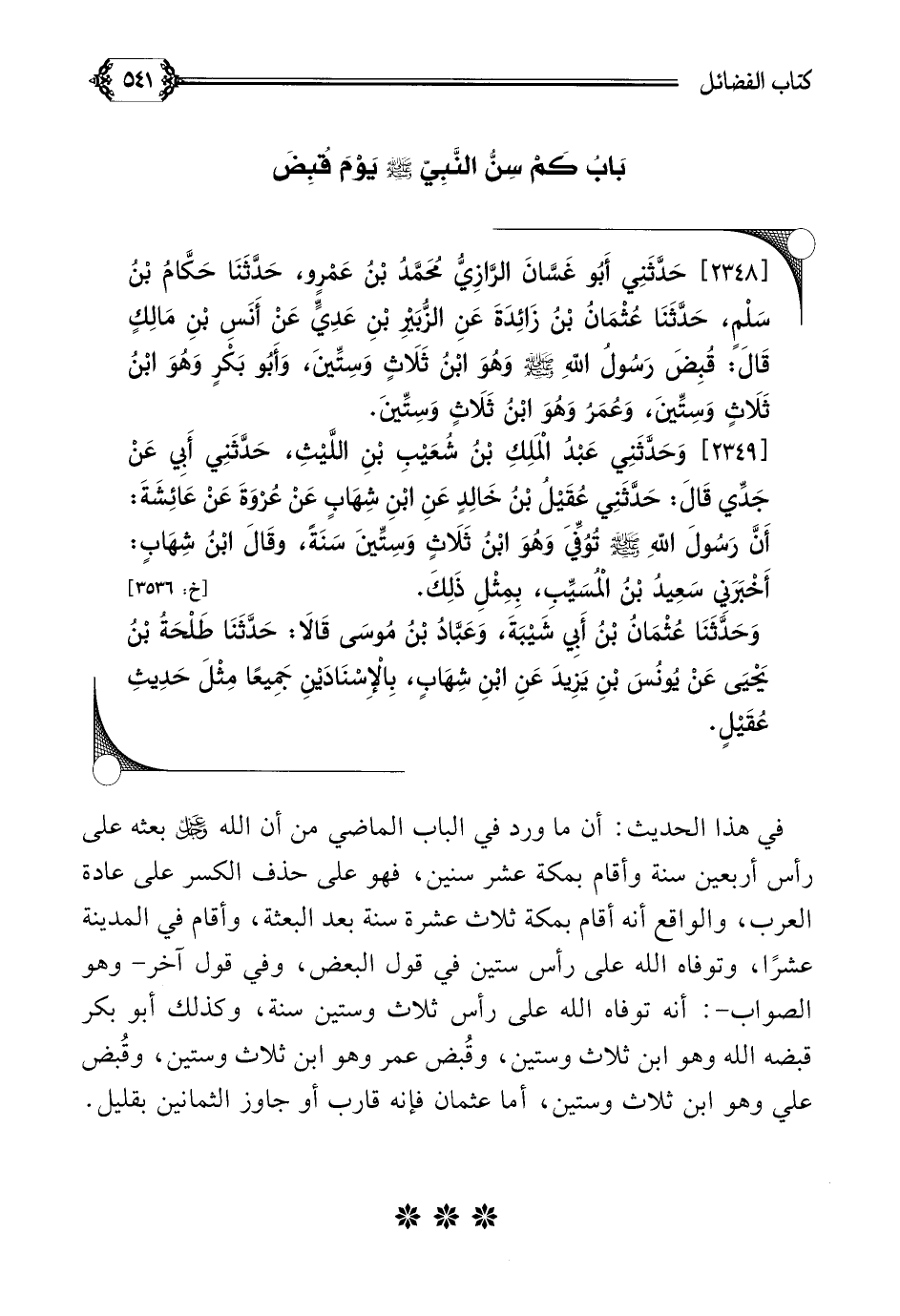 هذا الحديث فيه: أن ما ورد في الباب الماضي من أن الله عز وجل بعثه على رأس أربعين سنة وأقام بمكة عشر سنين، فهو على حذف الكسر على عادة العرب، والواقع أنه أقام بمكة ثلاث عشرة سنة بعد البعثة، وأقام في المدينة عشرًا، وتوفاه الله على رأس ستين في قول البعض، وفي قول آخر- وهو الصواب-: أنه توفاه الله على رأس ثلاث وستين سنة، وكذلك أبو بكر قبضه الله وهو ابن ثلاث وستين، وقبض عمر وهو ابن ثلاث وستين، وقبض علي وهو ابن ثلاث وستين، أما عثمان فإنه قارب أو جاوز الثمانين بقليل.