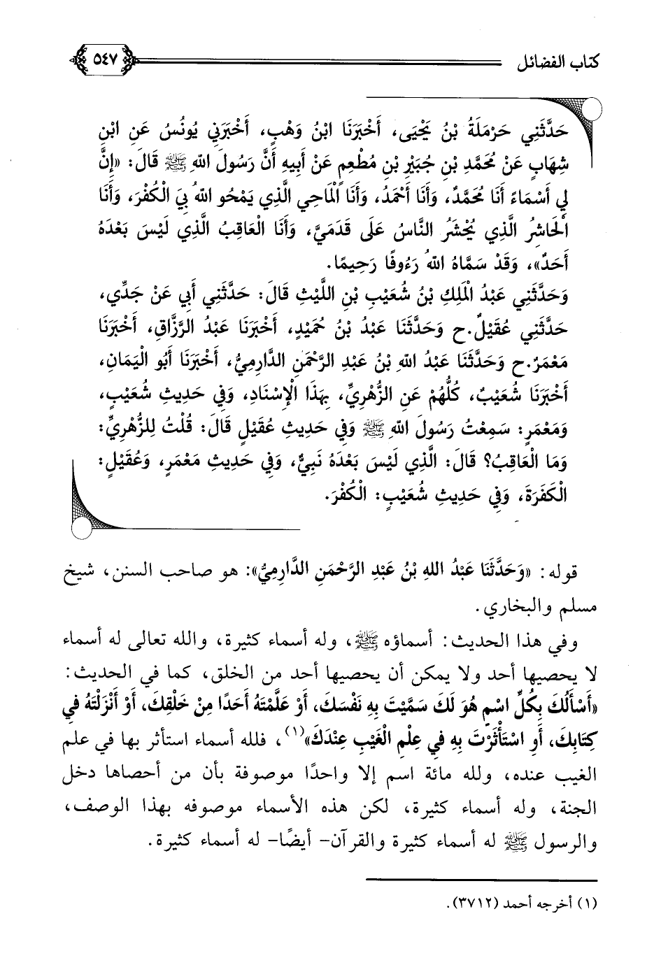حَدَّثَنِي حَرْمَلَةُ بْنُ يَحْيَى، أَخْبَرَنَا ابْنُ وَهْبٍ، أَخْبَرَنِي يُونُسُ عَنِ ابْنِ شِهَابٍ عَنْ مُحَمَّدِ بْنِ جُبَيْرِ بْنِ مُطْعِمٍ عَنْ أَبِيهِ أَنَّ رَسُولَ اللَّهِ صلى الله عليه وسلم قَالَ: ((إِنَّ لِي أَسْمَاءً أَنَا مُحَمَّدٌ، وَأَنَا أَحْمَدُ، وَأَنَا الْمَاحِي الَّذِي يَمْحُو اللَّهُ بِيَ الْكُفْرَ، وَأَنَا الْحَاشِرُ الَّذِي يُحْشَرُ النَّاسُ عَلَى قَدَمَيَّ، وَأَنَا الْعَاقِبُ الَّذِي لَيْسَ بَعْدَهُ أَحَدٌ، وَقَدْ سَمَّاهُ اللَّهُ رَءُوفًا رَحِيمًا)).