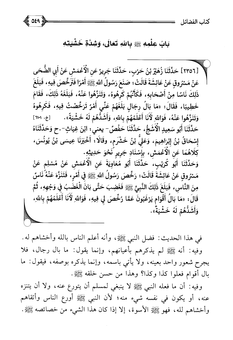 [٢٣٥٦] حَدَّثَنَا زُهَيْرُ بْنُ حَرْبٍ، حَدَّثَنَا جَرِيرٌ عَنِ الْأَعْمَشِ عَنْ أَبِي الضُّحَى عَنْ مَسْرُوقٍ عَنْ عَائِشَةَ قَالَتْ: صَنَعَ رَسُولُ اللَّهِ صلى الله عليه وسلم أَمْرًا فَتَرَخَّصَ فِيهِ، فَبَلَغَ ذَلِكَ نَاسًا مِنْ أَصْحَابِهِ، فَكَأَنَّهُمْ كَرِهُوهُ، وَتَنَزَّهُوا عَنْهُ، فَبَلَغَهُ ذَلِكَ، فَقَامَ خَطِيبًا، فَقَالَ: ((مَا بَالُ رِجَالٍ بَلَغَهُمْ عَنِّي أَمْرٌ تَرَخَّصْتُ فِيهِ، فَكَرِهُوهُ وَتَنَزَّهُوا عَنْهُ، فَوَاللَّهِ لَأَنَا أَعْلَمُهُمْ بِاللَّهِ، وَأَشَدُّهُمْ لَهُ خَشْيَةً)).