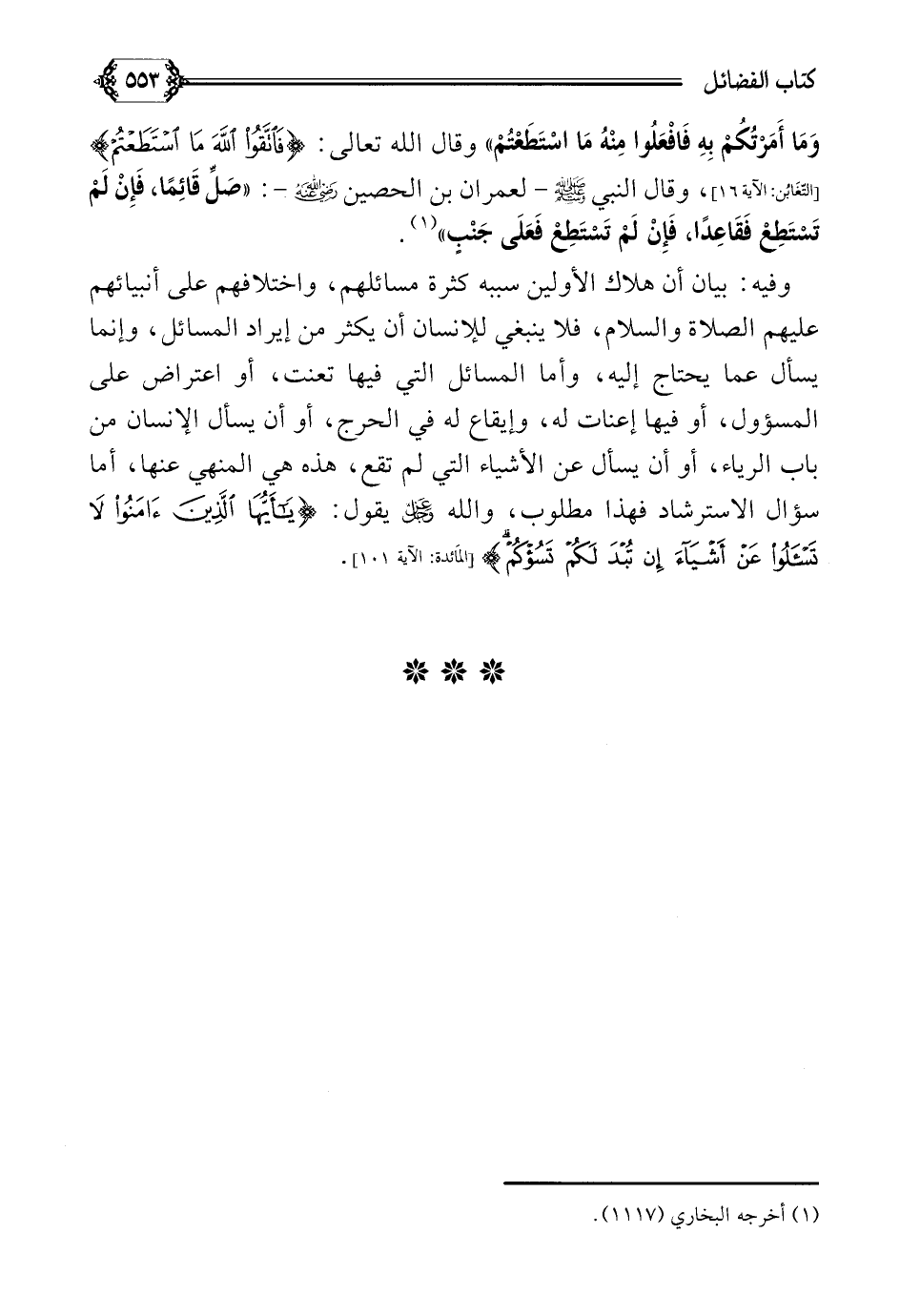 وَمَا أَمَرْتُكُمْ بِهِ فَافْعَلُوا مِنْهُ مَا اسْتَطَعْتُمْ)) وقال الله تعالى: {فاتقوا الله ما استطعتم}، وقال النبي صلى الله عليه وسلم لعمران بن الحصين رضي الله عنه: ((صَلِّ قَائِمًا، فَإِنْ لَمْ تَسْتَطِعْ فَقَاعِدًا، فَإِنْ لَمْ تَسْتَطِعْ فَعَلَى جَنْبٍ)) (¬١).
