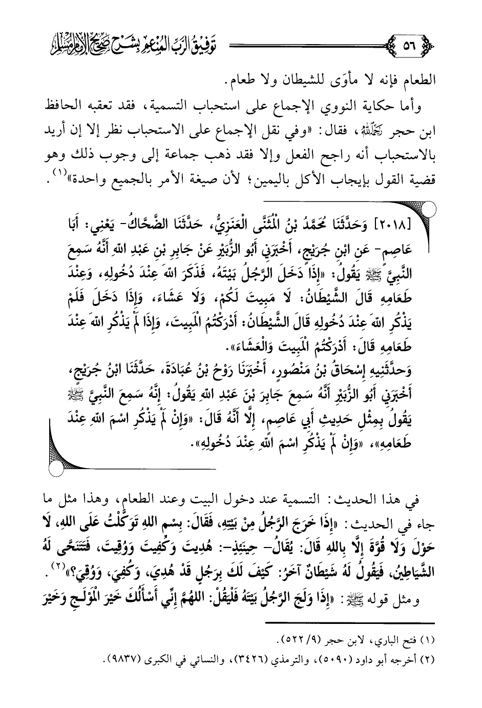 في هذا الحديث: التسمية عند دخول البيت وعند الطعام، وهذا مثل ما جاء في الحديث: ((إِذَا خَرَجَ الرَّجُلُ مِنْ بَيْتِهِ، فَقَالَ: بِسْمِ اللَّهِ تَوَكَّلْتُ عَلَى اللَّهِ، لَا حَوْلَ وَلَا قُوَّةَ إِلَّا بِاللَّهِ قَالَ: يُقَالُ- حِينَئِذٍ-: هُدِيتَ وَكُفِيتَ وَوُقِيتَ، فَتَتَنَحَّى لَهُ الشَّيَاطِينُ، فَيَقُولُ لَهُ شَيْطَانٌ آخَرُ: كَيْفَ لَكَ بِرَجُلٍ قَدْ هُدِيَ، وَكُفِيَ، وَوُقِيَ؟ )) (¬٢).