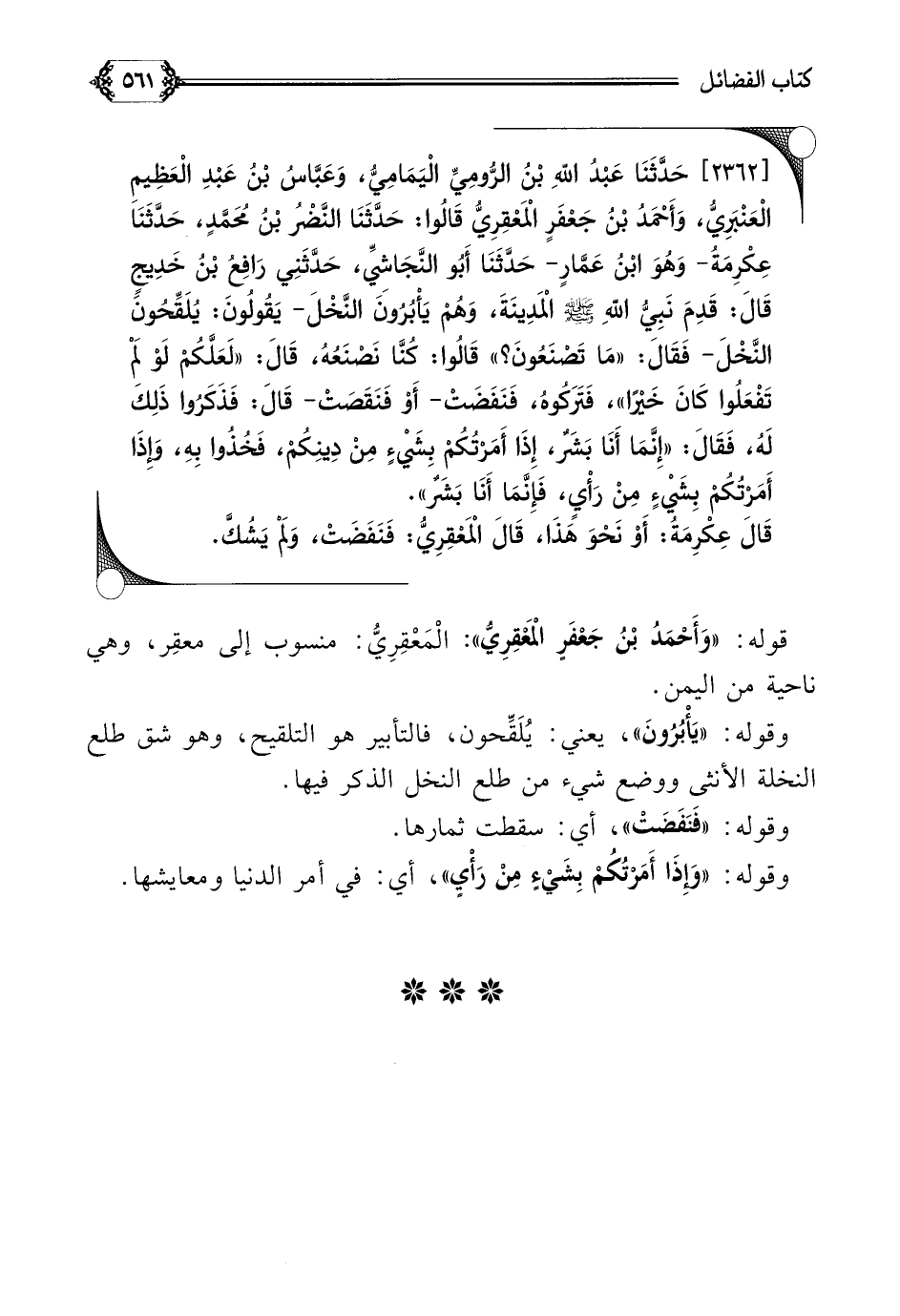 [٢٣٦٢] حَدَّثَنَا عَبْدُ اللَّهِ بْنُ الرُّومِيِّ الْيَمَامِيُّ، وَعَبَّاسُ بْنُ عَبْدِ الْعَظِيمِ الْعَنْبَرِيُّ، وَأَحْمَدُ بْنُ جَعْفَرٍ الْمَعْقِرِيُّ قَالُوا: حَدَّثَنَا النَّضْرُ بْنُ مُحَمَّدٍ، حَدَّثَنَا عِكْرِمَةُ- وَهُوَ ابْنُ عَمَّارٍ- حَدَّثَنَا أَبُو النَّجَاشِيِّ، حَدَّثَنِي رَافِعُ بْنُ خَدِيجٍ قَالَ: قَدِمَ نَبِيُّ اللَّهِ صلى الله عليه وسلم الْمَدِينَةَ، وَهُمْ يَأْبُرُونَ النَّخْلَ- يَقُولُونَ: يُلَقِّحُونَ النَّخْلَ- فَقَالَ: ((مَا تَصْنَعُونَ؟ )) قَالُوا: كُنَّا نَصْنَعُهُ، قَالَ: ((لَعَلَّكُمْ لَوْ لَمْ تَفْعَلُوا كَانَ خَيْرًا))، فَتَرَكُوهُ، فَنَفَضَتْ- أَوْ فَنَقَصَتْ- قَالَ: فَذَكَرُوا ذَلِكَ لَهُ، فَقَالَ: ((إِنَّمَا أَنَا بَشَرٌ، إِذَا أَمَرْتُكُمْ بِشَيْءٍ مِنْ دِينِكُمْ، فَخُذُوا بِهِ، وَإِذَا أَمَرْتُكُمْ بِشَيْءٍ مِنْ رَأْيٍ، فَإِنَّمَا أَنَا بَشَرٌ)).