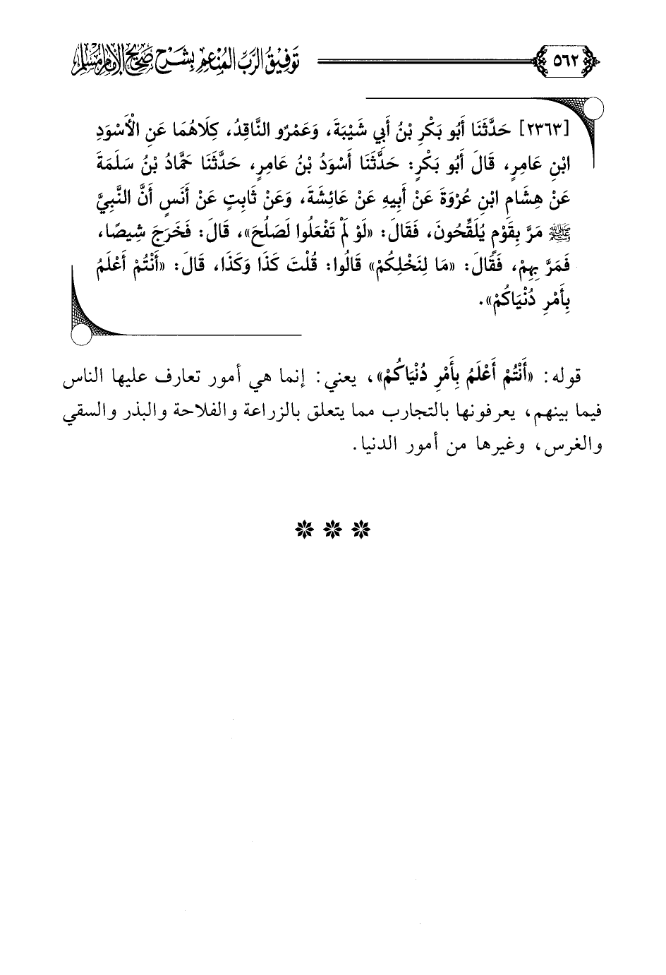 [٢٣٦٣] حَدَّثَنَا أَبُو بَكْرِ بْنُ أَبِي شَيْبَةَ، وَعَمْرٌو النَّاقِدُ، كِلَاهُمَا عَنِ الْأَسْوَدِ بْنِ عَامِرٍ، قَالَ أَبُو بَكْرٍ: حَدَّثَنَا أَسْوَدُ بْنُ عَامِرٍ، حَدَّثَنَا حَمَّادُ بْنُ سَلَمَةَ عَنْ هِشَامِ بْنِ عُرْوَةَ عَنْ أَبِيهِ عَنْ عَائِشَةَ، وَعَنْ ثَابِتٍ عَنْ أَنَسٍ أَنَّ النَّبِيَّ صلى الله عليه وسلم مَرَّ بِقَوْمٍ يُلَقِّحُونَ، فَقَالَ: ((لَوْ لَمْ تَفْعَلُوا لَصَلُحَ))، قَالَ: فَخَرَجَ شِيصًا، فَمَرَّ بِهِمْ، فَقَالَ: ((مَا لِنَخْلِكُمْ)) قَالُوا: قُلْتَ كَذَا وَكَذَا، قَالَ: ((أَنْتُمْ أَعْلَمُ بِأَمْرِ دُنْيَاكُمْ)).
