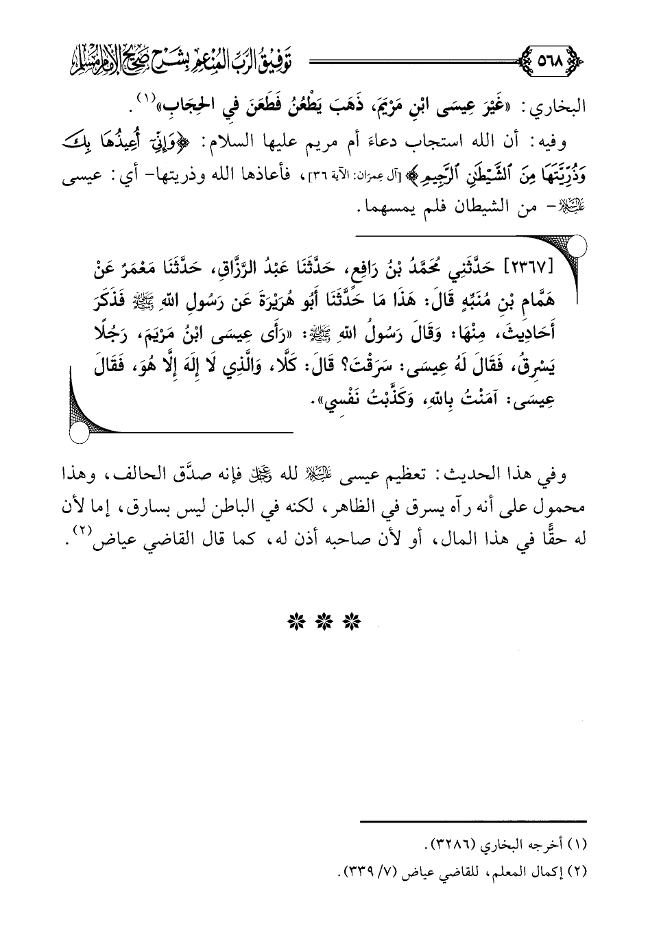 وهذا الحديث فيه: تعظيم عيسى عليه الصلاة والسلام لله عز وجل فإنه صدَّق الحالف، وهذا محمول على أنه رآه يسرق في الظاهر، لكنه في الباطن ليس بسارق، إما لأن له حقًّا في هذا المال، أو لأن صاحبه أذن له، كما قال القاضي عياض (¬٢).
