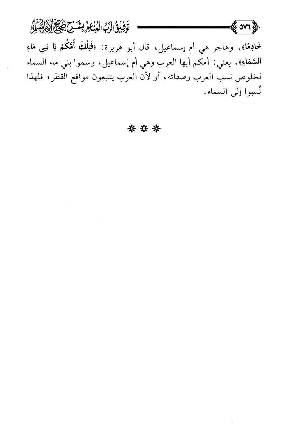 خَادِمًا))، وهاجر هي أم إسماعيل، قال أبو هريرة: ((فَتِلْكَ أُمُّكُمْ يَا بَنِي مَاءِ السَّمَاءِ))، يعني: أمكم أيها العرب وهي أم إسماعيل، وسموا بني ماء السماء لخلوص نسب العرب وصفائه، أو لأن العرب يتتبعون مواقع القطر؛ فلهذا نُسبوا إلى السماء.