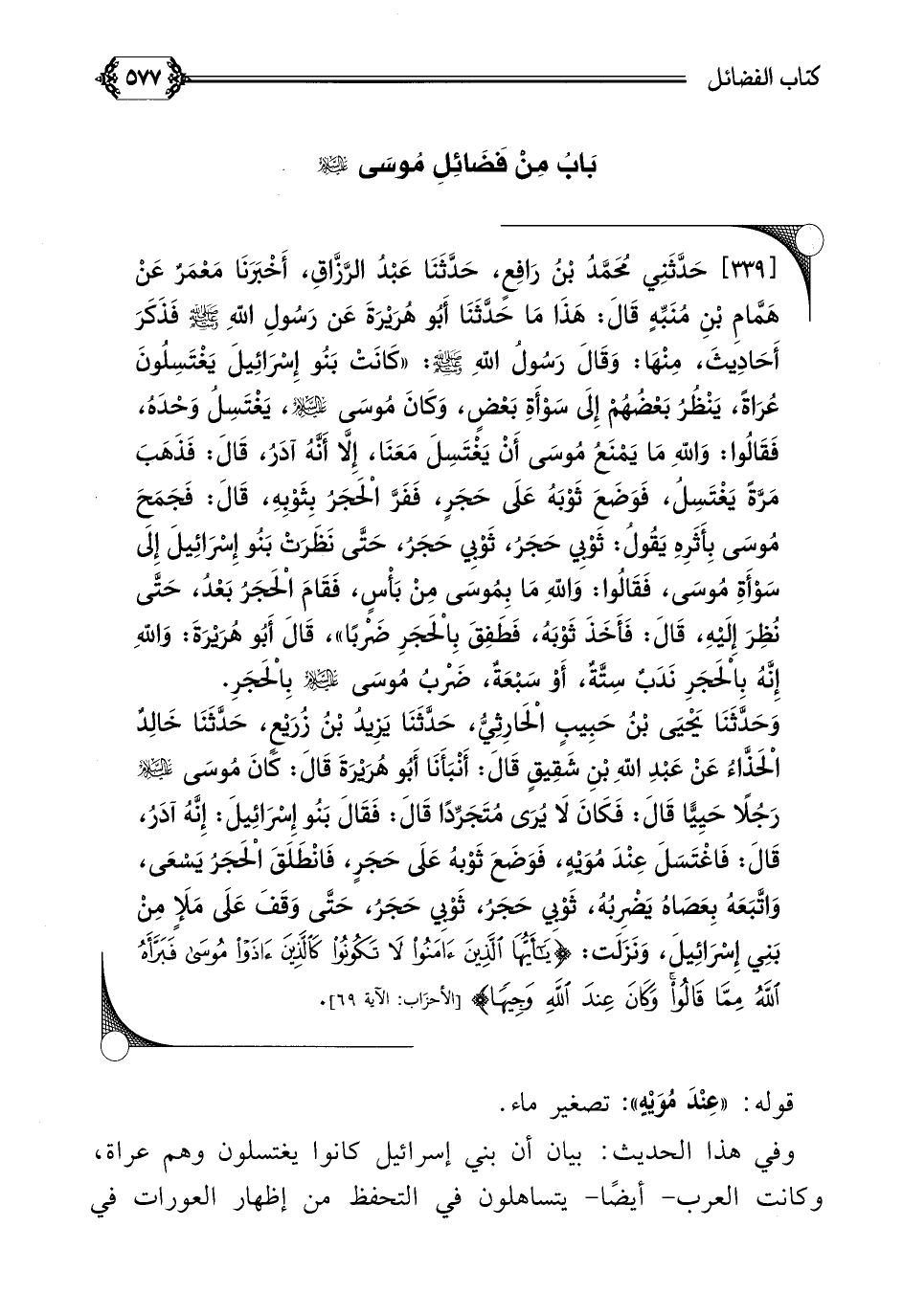 [٣٣٩] حَدَّثَنِي مُحَمَّدُ بْنُ رَافِعٍ، حَدَّثَنَا عَبْدُ الرَّزَّاقِ، أَخْبَرَنَا مَعْمَرٌ عَنْ هَمَّامِ بْنِ مُنَبِّهٍ قَالَ: هَذَا مَا حَدَّثَنَا أَبُو هُرَيْرَةَ عَن رَسُولِ اللَّهِ صلى الله عليه وسلم فَذَكَرَ أَحَادِيثَ، مِنْهَا: وَقَالَ رَسُولُ اللَّهِ صلى الله عليه وسلم: ((كَانَتْ بَنُو إِسْرَائِيلَ يَغْتَسِلُونَ عُرَاةً، يَنْظُرُ بَعْضُهُمْ إِلَى سَوْأَةِ بَعْضٍ، وَكَانَ مُوسَى عليه السلام، يَغْتَسِلُ وَحْدَهُ، فَقَالُوا: وَاللَّهِ مَا يَمْنَعُ مُوسَى أَنْ يَغْتَسِلَ مَعَنَا، إِلَّا أَنَّهُ آدَرُ، قَالَ: فَذَهَبَ مَرَّةً يَغْتَسِلُ، فَوَضَعَ ثَوْبَهُ عَلَى حَجَرٍ، فَفَرَّ الْحَجَرُ بِثَوْبِهِ، قَالَ: فَجَمَحَ مُوسَى بِأَثَرِهِ يَقُولُ: ثَوْبِي حَجَرُ، ثَوْبِي حَجَرُ، حَتَّى نَظَرَتْ بَنُو إِسْرَائِيلَ إِلَى سَوْأَةِ مُوسَى، فَقَالُوا: وَاللَّهِ مَا بِمُوسَى مِنْ بَأْسٍ، فَقَامَ الْحَجَرُ بَعْدُ، حَتَّى نُظِرَ إِلَيْهِ، قَالَ: فَأَخَذَ ثَوْبَهُ، فَطَفِقَ بِالْحَجَرِ ضَرْبًا))، قَالَ أَبُو هُرَيْرَةَ: وَاللَّهِ إِنَّهُ بِالْحَجَرِ نَدَبٌ سِتَّةٌ، أَوْ سَبْعَةٌ، ضَرْبُ مُوسَى عليه السلام بِالْحَجَرِ.