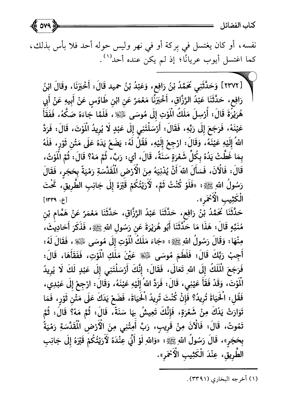 حَدَّثَنَا مُحَمَّدُ بْنُ رَافِعٍ، حَدَّثَنَا عَبْدُ الرَّزَّاقِ، حَدَّثَنَا مَعْمَرٌ عَنْ هَمَّامِ بْنِ مُنَبِّهٍ قَالَ: هَذَا مَا حَدَّثَنَا أَبُو هُرَيْرَةَ عَنِ رَسُولِ اللَّهِ صلى الله عليه وسلم، فَذَكَرَ أَحَادِيثَ، مِنْهَا: وَقَالَ رَسُولُ اللَّهِ صلى الله عليه وسلم: ((جَاءَ مَلَكُ الْمَوْتِ إِلَى مُوسَى عليه السلام، فَقَالَ لَهُ: أَجِبْ رَبَّكَ قَالَ: فَلَطَمَ مُوسَى عليه السلام عَيْنَ مَلَكِ الْمَوْتِ، فَفَقَأَهَا، قَالَ: فَرَجَعَ الْمَلَكُ إِلَى اللَّهِ تَعَالَى، فَقَالَ: إِنَّكَ أَرْسَلْتَنِي إِلَى عَبْدٍ لَكَ لَا يُرِيدُ الْمَوْتَ، وَقَدْ فَقَأَ عَيْنِي، قَالَ: فَرَدَّ اللَّهُ إِلَيْهِ عَيْنَهُ، وَقَالَ: ارْجِعْ إِلَى عَبْدِي، فَقُلِ: الْحَيَاةَ تُرِيدُ؟ فَإِنْ كُنْتَ تُرِيدُ الْحَيَاةَ، فَضَعْ يَدَكَ عَلَى مَتْنِ ثَوْرٍ، فَمَا تَوَارَتْ يَدُكَ مِنْ شَعْرَةٍ، فَإِنَّكَ تَعِيشُ بِهَا سَنَةً، قَالَ: ثُمَّ مَهْ؟ قَالَ: ثُمَّ تَمُوتُ، قَالَ: فَالْآنَ مِنْ قَرِيبٍ، رَبِّ أَمِتْنِي مِنَ الْأَرْضِ الْمُقَدَّسَةِ رَمْيَةً بِحَجَرٍ))، قَالَ رَسُولُ اللَّهِ صلى الله عليه وسلم: ((وَاللَّهِ لَوْ أَنِّي عِنْدَهُ لَأَرَيْتُكُمْ قَبْرَهُ إِلَى جَانِبِ الطَّرِيقِ، عِنْدَ الْكَثِيبِ الْأَحْمَرِ)).
