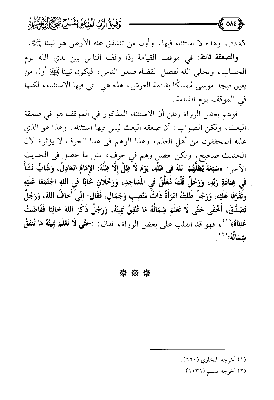 فوهم بعض الرواة وظن أن الاستثناء المذكور في الموقف هو في صعقة البعث، ولكن الصواب أن صعقة البعث ليس فيها استثناء، وهذا هو الذي عليه المحققون من أهل العلم، وهذا الوهم في هذا الحرف لا يؤثر؛ لأن الحديث صحيح، ولكن حصل وهم في حرف، مثل ما حصل في الحديث الآخر: ((سَبْعَةٌ يُظِلُّهُمُ اللَّهُ فِي ظِلِّهِ، يَوْمَ لا ظِلَّ إِلَّا ظِلُّهُ: الإِمَامُ العَادِلُ، وَشَابٌّ نَشَأَ فِي عِبَادَةِ رَبِّهِ، وَرَجُلٌ قَلْبُهُ مُعَلَّقٌ فِي المَسَاجِدِ، وَرَجُلانِ تَحَابَّا فِي اللَّهِ اجْتَمَعَا عَلَيْهِ وَتَفَرَّقَا عَلَيْهِ، وَرَجُلٌ طَلَبَتْهُ امْرَأَةٌ ذَاتُ مَنْصِبٍ وَجَمَالٍ، فَقَالَ: إِنِّي أَخَافُ اللَّهَ، وَرَجُلٌ تَصَدَّقَ، أَخْفَى حَتَّى لا تَعْلَمَ شِمَالُهُ مَا تُنْفِقُ يَمِينُهُ، وَرَجُلٌ ذَكَرَ اللَّهَ خَالِيًا فَفَاضَتْ عَيْنَاهُ)) (¬١)، فهو قد انقلب على بعض الرواة، فقال: ((حَتَّى لَا تَعْلَمَ يَمِينُهُ مَا تُنْفِقُ شِمَالُهُ)). (¬٢)