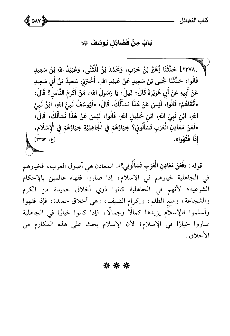 [٢٣٧٨] حَدَّثَنَا زُهَيْرُ بْنُ حَرْبٍ، وَمُحَمَّدُ بْنُ الْمُثَنَّى، وَعُبَيْدُ اللَّهِ بْنُ سَعِيدٍ قَالُوا: حَدَّثَنَا يَحْيَى بْنُ سَعِيدٍ عَنْ عُبَيْدِ اللَّهِ، أَخْبَرَنِي سَعِيدُ بْنُ أَبِي سَعِيدٍ عَنْ أَبِيهِ عَنْ أَبِي هُرَيْرَةَ قَالَ: قِيلَ: يَا رَسُولَ اللَّهِ، مَنْ أَكْرَمُ النَّاسِ؟ قَالَ: ((أَتْقَاهُمْ)) قَالُوا: لَيْسَ عَنْ هَذَا نَسْأَلُكَ، قَالَ: ((فَيُوسُفُ نَبِيُّ اللَّهِ، ابْنُ نَبِيِّ اللَّهِ، ابْنِ نَبِيِّ اللَّهِ، ابْنِ خَلِيلِ اللَّهِ)) قَالُوا: لَيْسَ عَنْ هَذَا نَسْأَلُكَ، قَالَ: ((فَعَنْ مَعَادِنِ الْعَرَبِ تَسْأَلُونِي؟ خِيَارُهُمْ فِي الْجَاهِلِيَّةِ خِيَارُهُمْ فِي الْإِسْلَامِ، إِذَا فَقُهُوا)).