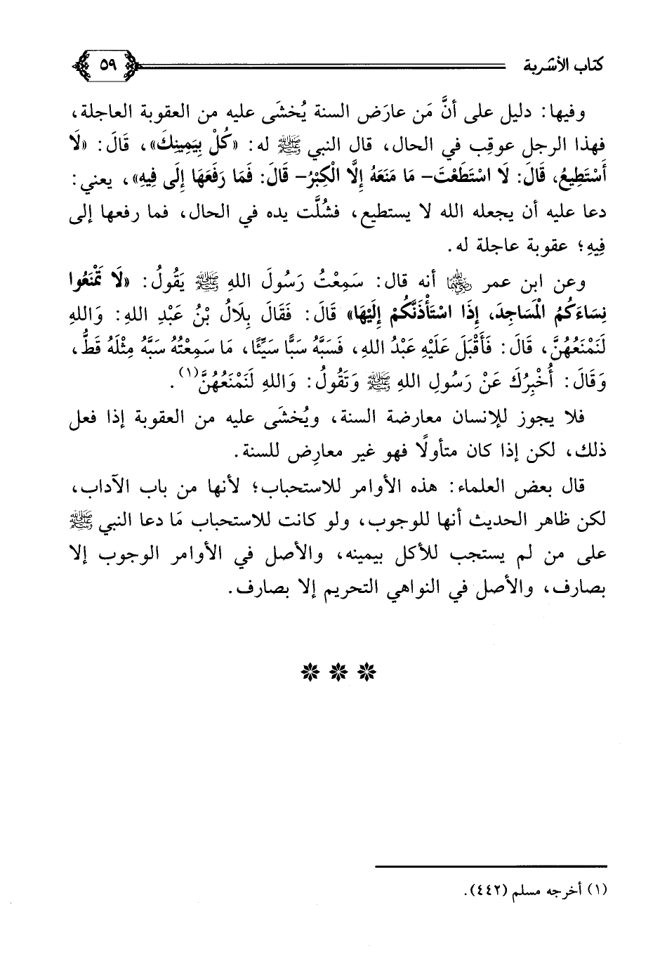 وفيها: دليل على أنَّ مَن عارَض السنة يُخشَى عليه من العقوبة العاجلة، فهذا الرجل عوقِب في الحال، قال النبي صلى الله عليه وسلم له: ((كُلْ بِيَمِينِكَ))، قَالَ: ((لَا أَسْتَطِيعُ، قَالَ: ((لَا اسْتَطَعْتَ)) - مَا مَنَعَهُ إِلَّا الْكِبْرُ- قَالَ: فَمَا رَفَعَهَا إِلَى فِيهِ))، يعني: دعا عليه أن يجعله الله لا يستطيع، فشُلَّت يده في الحال، فما رفعها إلى فِيهِ؛ عقوبة عاجلة له.
