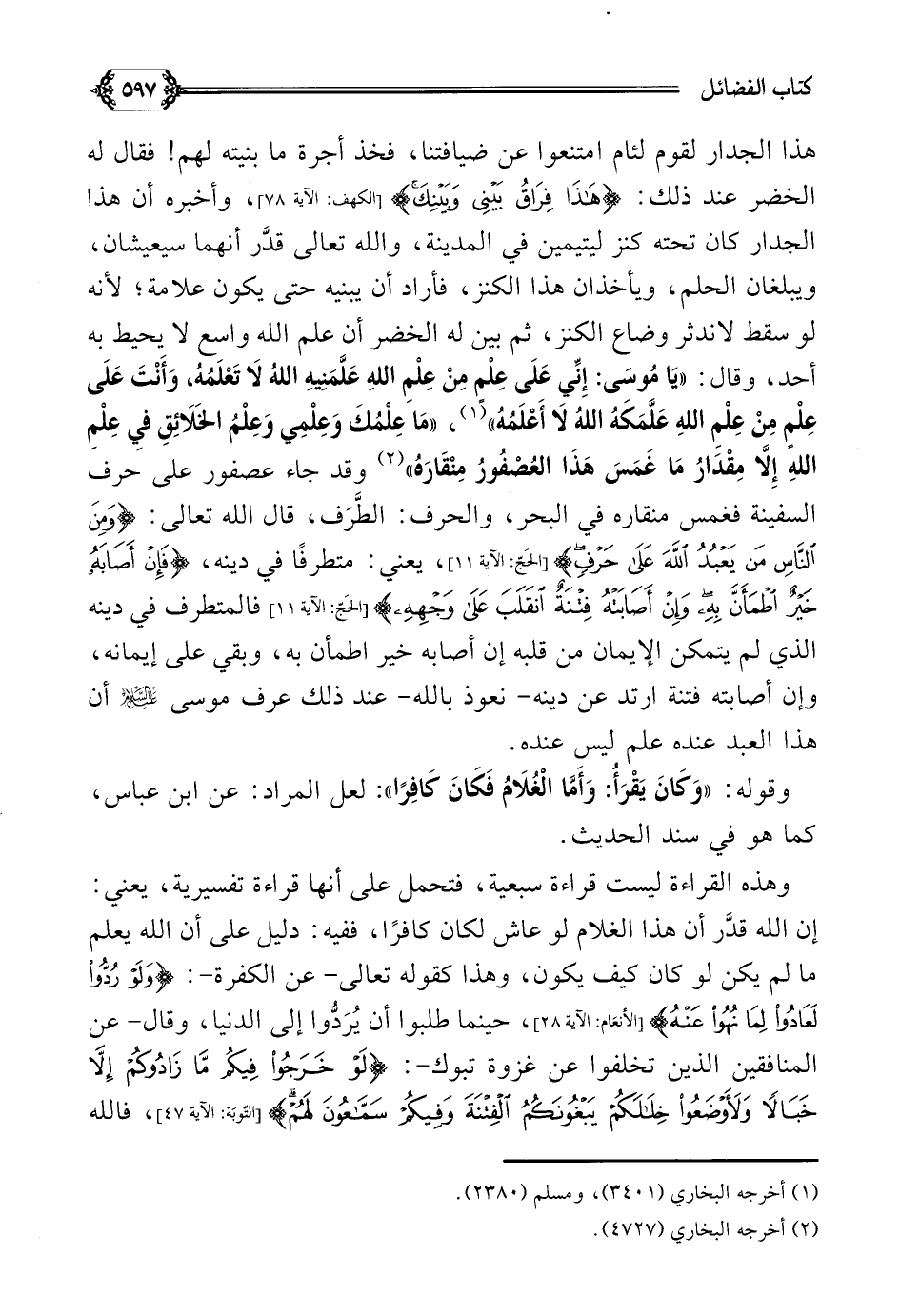 هذا الجدار لقوم لئام امتنعوا عن ضيافتنا، فخذ أجرة ما بنيته لهم! فقال له الخضر عند ذلك: {هذا فراق بيني وبينك}، وأخبره أن هذا الجدار كان تحته كنز ليتيمين في المدينة، والله تعالى قدَّر أنهما سيعيشان، ويبلغان الحلم، ويأخذان هذا الكنز، فأراد أن يبنيه حتى يكون علامة، لأنه لو سقط لاندثر وضاع الكنز، ثم بين له الخضر أن علم الله واسع لا يحيط به أحد، وقال: ((يَا مُوسَى: إِنِّي عَلَى عِلْمٍ مِنْ عِلْمِ اللَّهِ عَلَّمَنِيهِ اللَّهُ لا تَعْلَمُهُ، وَأَنْتَ عَلَى عِلْمٍ مِنْ عِلْمِ اللَّهِ عَلَّمَكَهُ اللَّهُ لا أَعْلَمُهُ)) (¬١)، ((مَا عِلْمُكَ وَعِلْمِي وَعِلْمُ الخَلائِقِ فِي عِلْمِ اللَّهِ إِلَّا مِقْدَارُ مَا غَمَسَ هَذَا العُصْفُورُ مِنْقَارَهُ)) (¬٢) وقد جاء عصفور على حرف السفينة فغمس منقاره في البحر، والحرف: الطَّرَف، قال الله تعالى: {وَمِنَ النَّاسِ مَنْ يَعْبُدُ اللَّهَ عَلَى حَرْفٍ {، يعني: متطرفًا في دينه} فَإِنْ أَصَابَهُ خَيْرٌ اطْمَأَنَّ بِهِ وَإِنْ أَصَابَتْهُ فِتْنَةٌ انقَلَبَ عَلَى وَجْهِهِ} فالمتطرف في دينه الذي لم يتمكن الإيمان من قلبه إن أصابه خير اطمأن به، وبقي على إيمانه، وإن أصابته فتنة ارتد عن دينه- نعوذ بالله- عند ذلك عرف موسى عليه السلام أن هذا العبد عنده علم ليس عنده.