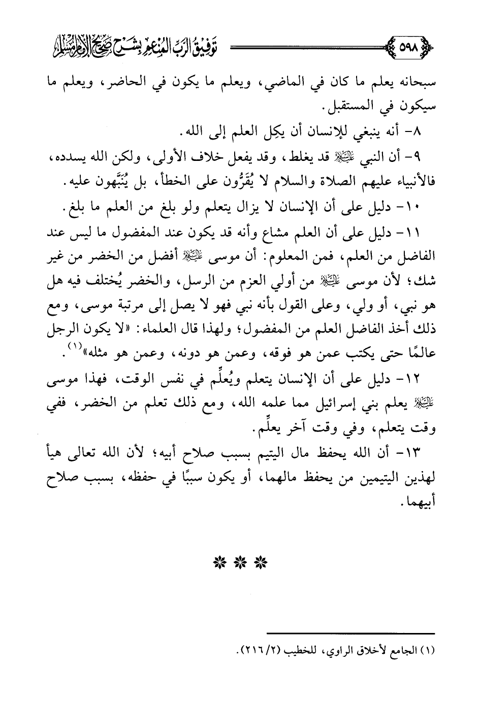 ١١ - دليل على أن العلم مشاع وأنه قد يكون عند المفضول ما ليس عند الفاضل من العلم، فمن المعلوم أن موسى عليه السلام أفضل من الخضر من غير شك؛ لأن موسى عليه الصلاة والسلام من أولي العزم من الرسل، والخضر يُختلف فيه هل هو نبي، أو ولي، وعلى القول بأنه نبي فهو لا يصل إلى مرتبة موسى، ومع ذلك أخذ الفاضل العلم من المفضول؛ ولهذا قال العلماء: ((لا يكون الرجل عالمًا حتى يكتب عمن هو فوقه، وعمن هو دونه، وعمن هو مثله)) (¬١).