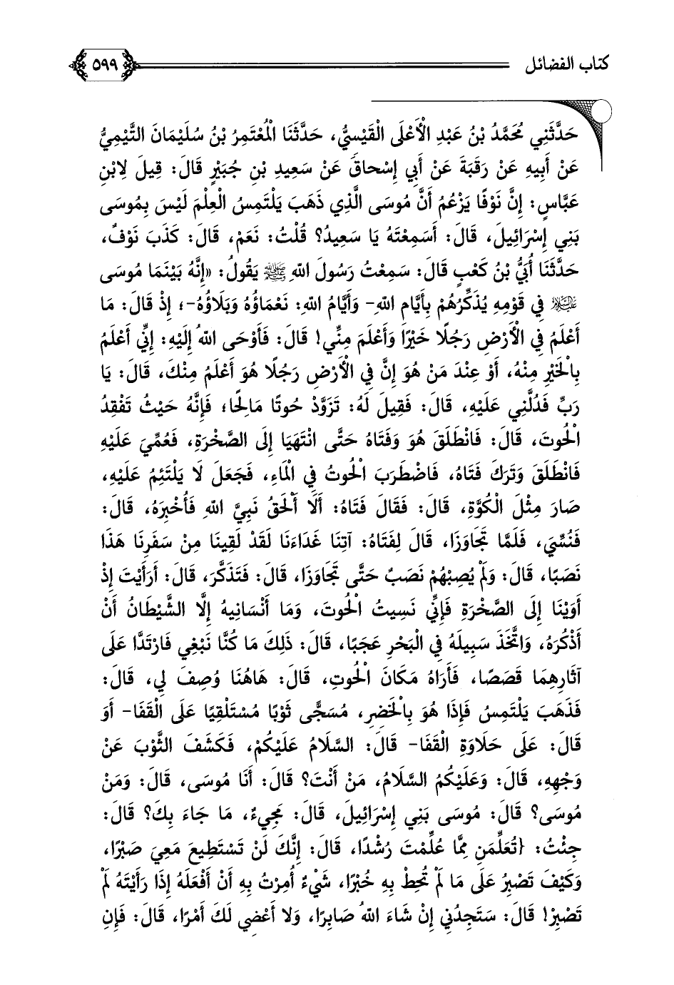 حَدَّثَنِي مُحَمَّدُ بْنُ عَبْدِ الْأَعْلَى الْقَيْسِيُّ، حَدَّثَنَا الْمُعْتَمِرُ بْنُ سُلَيْمَانَ التَّيْمِيُّ عَنْ أَبِيهِ عَنْ رَقَبَةَ عَنْ أَبِي إِسْحاقَ عَنْ سَعِيدِ بْنِ جُبَيْرٍ قَالَ: قِيلَ لِابْنِ عَبَّاسٍ: إِنَّ نَوْفًا يَزْعُمُ أَنَّ مُوسَى الَّذِي ذَهَبَ يَلْتَمِسُ الْعِلْمَ لَيْسَ بِمُوسَى بَنِي إِسْرَائِيلَ، قَالَ: أَسَمِعْتَهُ يَا سَعِيدُ؟ قُلْتُ: نَعَمْ، قَالَ: كَذَبَ نَوْفٌ، حَدَّثَنَا أُبَيُّ بْنُ كَعْبٍ قَالَ: سَمِعْتُ رَسُولَ اللَّهِ صلى الله عليه وسلم يَقُولُ: ((إِنَّهُ بَيْنَمَا مُوسَى عليه السلام فِي قَوْمِهِ يُذَكِّرُهُمْ بِأَيَّامِ اللَّهِ- وَأَيَّامُ اللَّهِ: نَعْمَاؤُهُ وَبَلَاؤُهُ-؛ إِذْ قَالَ: مَا أَعْلَمُ فِي الْأَرْضِ رَجُلًا خَيْرًا وَأَعْلَمَ مِنِّي! قَالَ: فَأَوْحَى اللَّهُ إِلَيْهِ: إِنِّي أَعْلَمُ بِالْخَيْرِ مِنْهُ، أَوْ عِنْدَ مَنْ هُوَ إِنَّ فِي الْأَرْضِ رَجُلًا هُوَ أَعْلَمُ مِنْكَ، قَالَ: يَا رَبِّ فَدُلَّنِي عَلَيْهِ، قَالَ: فَقِيلَ لَهُ: تَزَوَّدْ حُوتًا مَالِحًا؛ فَإِنَّهُ حَيْثُ تَفْقِدُ الْحُوتَ، قَالَ: فَانْطَلَقَ هُوَ وَفَتَاهُ حَتَّى انْتَهَيَا إِلَى الصَّخْرَةِ، فَعُمِّيَ عَلَيْهِ فَانْطَلَقَ وَتَرَكَ فَتَاهُ، فَاضْطَرَبَ الْحُوتُ فِي الْمَاءِ، فَجَعَلَ لَا يَلْتَئِمُ عَلَيْهِ، صَارَ مِثْلَ الْكُوَّةِ، قَالَ: فَقَالَ فَتَاهُ: أَلَا أَلْحَقُ نَبِيَّ اللَّهِ فَأُخْبِرَهُ، قَالَ: فَنُسِّيَ، فَلَمَّا تَجَاوَزَا، قَالَ لِفَتَاهُ: آتِنَا غَدَاءَنَا لَقَدْ لَقِينَا مِنْ سَفَرِنَا هَذَا نَصَبًا، قَالَ: وَلَمْ يُصِبْهُمْ نَصَبٌ حَتَّى تَجَاوَزَا، قَالَ: فَتَذَكَّرَ، قَالَ: أَرَأَيْتَ إِذْ أَوَيْنَا إِلَى الصَّخْرَةِ فَإِنِّي نَسِيتُ الْحُوتَ، وَمَا أَنْسَانِيهُ إِلَّا الشَّيْطَانُ أَنْ أَذْكُرَهُ، وَاتَّخَذَ سَبِيلَهُ فِي