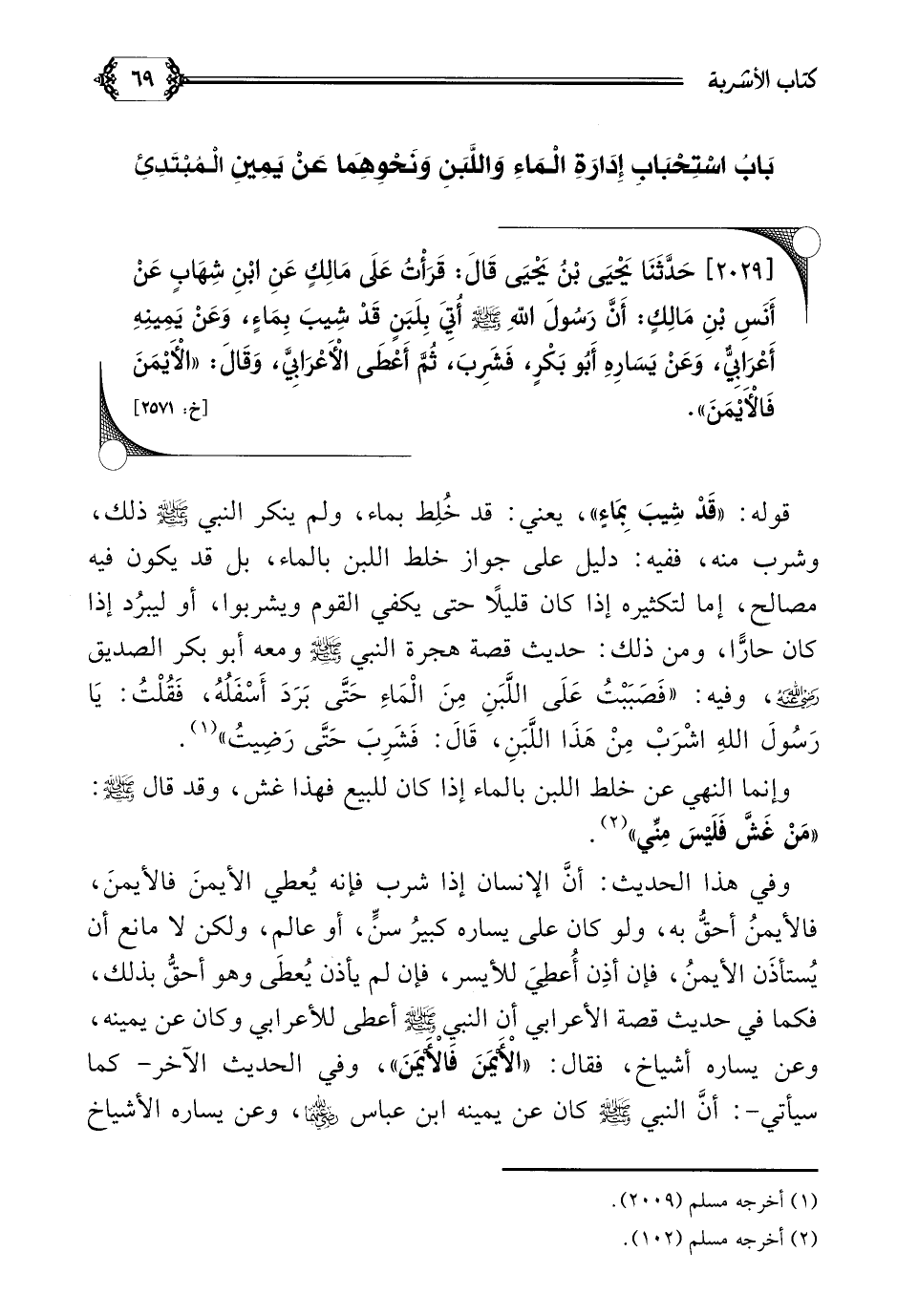 [٢٠٢٩] حَدَّثَنَا يَحْيَى بْنُ يَحْيَى قَالَ: قَرَأْتُ عَلَى مَالِكٍ عَنِ ابْنِ شِهَابٍ عَنْ أَنَسِ بْنِ مَالِكٍ: أَنَّ رَسُولَ اللَّهِ صلى الله عليه وسلم أُتِيَ بِلَبَنٍ قَدْ شِيبَ بِمَاءٍ، وَعَنْ يَمِينِهِ أَعْرَابِيٌّ، وَعَنْ يَسَارِهِ أَبُو بَكْرٍ، فَشَرِبَ، ثُمَّ أَعْطَى الْأَعْرَابِيَّ، وَقَالَ: ((الْأَيْمَنَ فَالْأَيْمَنَ)).