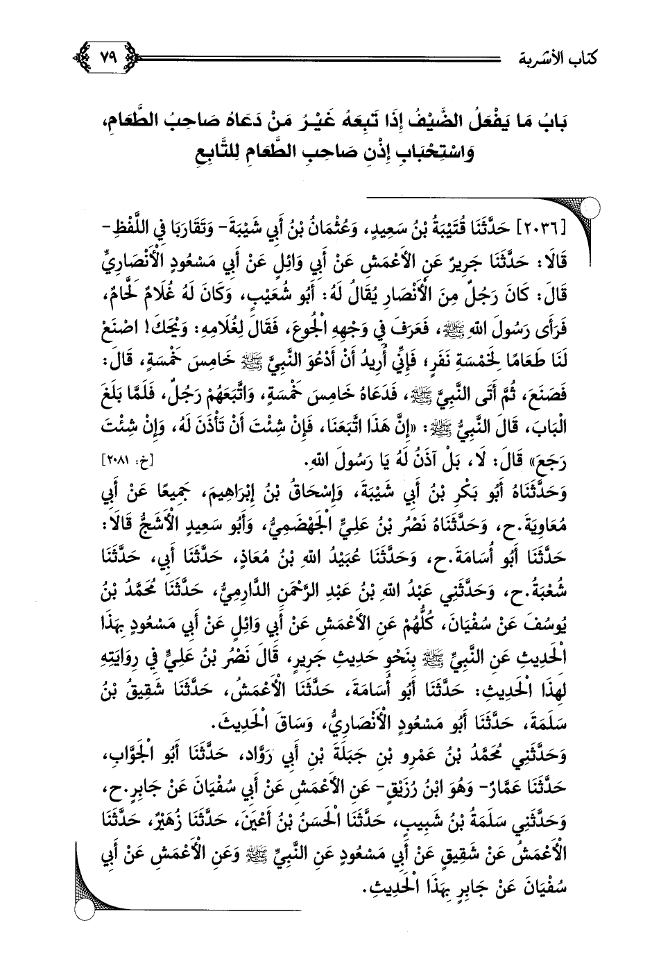 [٢٠٣٦] حَدَّثَنَا قُتَيْبَةُ بْنُ سَعِيدٍ، وَعُثْمَانُ بْنُ أَبِي شَيْبَةَ- وَتَقَارَبَا فِي اللَّفْظِ- قَالَا: حَدَّثَنَا جَرِيرٌ عَنِ الأَعْمَشِ عَنْ أَبِي وَائِلٍ عَنْ أَبِي مَسْعُودٍ الْأَنْصَارِيِّ قَالَ: كَانَ رَجُلٌ مِنْ الْأَنْصَارِ يُقَالُ لَهُ: أَبُو شُعَيْبٍ، وَكَانَ لَهُ غُلَامٌ لَحَّامٌ، فَرَأَى رَسُولَ اللَّهِ صلى الله عليه وسلم، فَعَرَفَ فِي وَجْهِهِ الْجُوعَ، فَقَالَ لِغُلَامِهِ: وَيْحَكَ! اصْنَعْ لَنَا طَعَامًا لِخَمْسَةِ نَفَرٍ؛ فَإِنِّي أُرِيدُ أَنْ أَدْعُوَ النَّبِيَّ صلى الله عليه وسلم خَامِسَ خَمْسَةٍ، قَالَ: فَصَنَعَ، ثُمَّ أَتَى النَّبِيَّ صلى الله عليه وسلم، فَدَعَاهُ خَامِسَ خَمْسَةٍ، وَاتَّبَعَهُمْ رَجُلٌ، فَلَمَّا بَلَغَ الْبَابَ، قَالَ النَّبِيُّ صلى الله عليه وسلم: ((إِنَّ هَذَا اتَّبَعَنَا، فَإِنْ شِئْتَ أَنْ تَأْذَنَ لَهُ، وَإِنْ شِئْتَ رَجَعَ)) قَالَ: لَا، بَلْ آذَنُ لَهُ يَا رَسُولَ اللَّهِ.