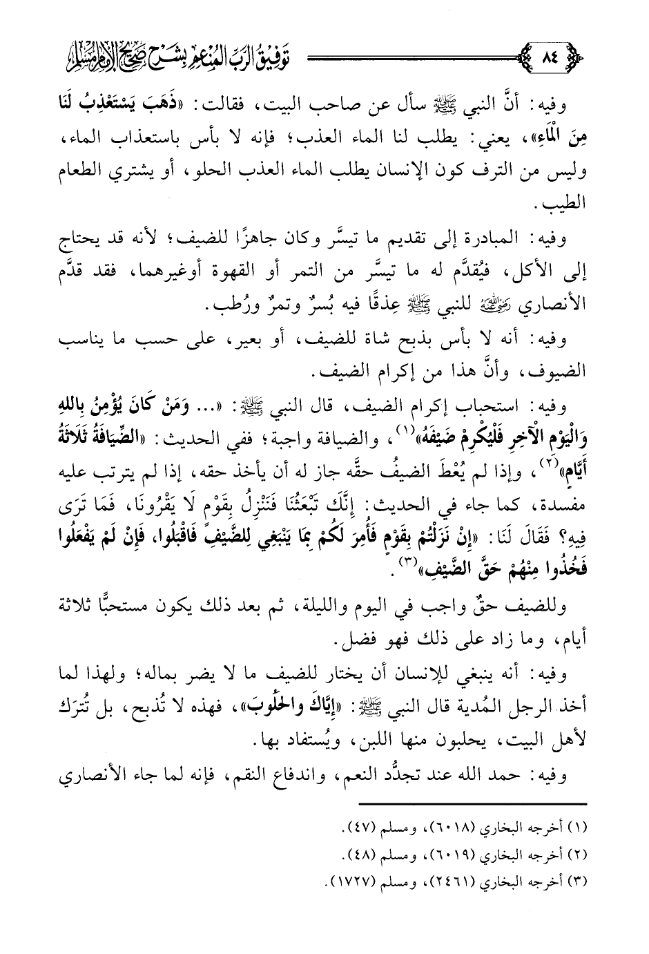 وفيه: استحباب إكرام الضيف، قال النبي صلى الله عليه وسلم: ((وَمَنْ كَانَ يُؤْمِنُ بِاللَّهِ وَالْيَوْمِ الْآخِرِ فَلْيُكْرِمْ ضَيْفَهُ)) (¬١)، والضيافة واجبة؛ ففي الحديث: ((الضِّيَافَةُ ثَلَاثَةُ أَيَّامٍ)) (¬٢)، وإذا لم يُعْطَ الضيفُ حقَّه جاز له أن يأخذ حقه، إذا لم يترتب عليه مفسدة، كما جاء في الحديث: ((إِنَّكَ تَبْعَثُنَا فَنَنْزِلُ بِقَوْمٍ لَا يَقْرُونَا، فَمَا تَرَى فِيهِ؟ فَقَالَ لَنَا: إِنْ نَزَلْتُمْ بِقَوْمٍ فَأُمِرَ لَكُمْ بِمَا يَنْبَغِي لِلضَّيْفِ فَاقْبَلُوا، فَإِنْ لَمْ يَفْعَلُوا فَخُذُوا مِنْهُمْ حَقَّ الضَّيْفِ)) (¬٣).