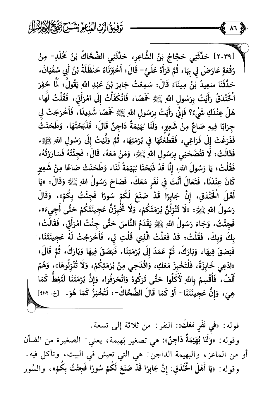 [٢٠٣٩] حَدَّثَنِي حَجَّاجُ بْنُ الشَّاعِرِ، حَدَّثَنِي الضَّحَّاكُ بْنُ مَخْلَدٍ- مِنْ رُقْعَةٍ عَارَضَ لِي بِهَا، ثُمَّ قَرَأَهُ عَلَيَّ- قَالَ: أَخْبَرَنَاهُ حَنْظَلَةُ بْنُ أَبِي سُفْيَانَ، حَدَّثَنَا سَعِيدُ بْنُ مِينَاءَ قَالَ: سَمِعْتُ جَابِرَ بْنَ عَبْدِ اللَّهِ يَقُولُ: لَمَّا حُفِرَ الْخَنْدَقُ رَأَيْتُ بِرَسُولِ اللَّهِ صلى الله عليه وسلم خَمَصًا، فَانْكَفَأْتُ إِلَى امْرَأَتِي، فَقُلْتُ لَهَا: هَلْ عِنْدَكِ شَيْءٌ؟ فَإِنِّي رَأَيْتُ بِرَسُولِ اللَّهِ صَلَّى اللَّهُ عَلَيْهِ وَسَلَّمَ خَمَصًا شَدِيدًا، فَأَخْرَجَتْ لِي جِرَابًا فِيهِ صَاعٌ مِنْ شَعِيرٍ، وَلَنَا بُهَيْمَةٌ دَاجِنٌ قَالَ: فَذَبَحْتُهَا، وَطَحَنَتْ فَفَرَغَتْ إِلَى فَرَاغِي، فَقَطَّعْتُهَا فِي بُرْمَتِهَا، ثُمَّ وَلَّيْتُ إِلَى رَسُولِ اللَّهِ صلى الله عليه وسلم، فَقَالَتْ: لَا تَفْضَحْنِي بِرَسُولِ اللَّهِ صلى الله عليه وسلم، وَمَنْ مَعَهُ، قَالَ: فَجِئْتُهُ فَسَارَرْتُهُ، فَقُلْتُ: يَا رَسُولَ اللَّهِ، إِنَّا قَدْ ذَبَحْنَا بُهَيْمَةً لَنَا، وَطَحَنَتْ صَاعًا مِنْ شَعِيرٍ كَانَ عِنْدَنَا، فَتَعَالَ أَنْتَ فِي نَفَرٍ مَعَكَ، فَصَاحَ رَسُولُ اللَّهِ صلى الله عليه وسلم وَقَالَ: ((يَا أَهْلَ الْخَنْدَقِ، إِنَّ جَابِرًا قَدْ صَنَعَ لَكُمْ سُورًا فَجِئْتُ بِكُمْ))، وَقَالَ رَسُولُ اللَّهِ صلى الله عليه وسلم: ((لَا تُنْزِلُنَّ بُرْمَتَكُمْ، وَلَا تَخْبِزُنَّ عَجِينَتَكُمْ حَتَّى أَجِيءَ))، فَجِئْتُ، وَجَاءَ رَسُولُ اللَّهِ صلى الله عليه وسلم يَقْدَمُ النَّاسَ حَتَّى جِئْتُ امْرَأَتِي، فَقَالَتْ: بِكَ وَبِكَ، فَقُلْتُ: قَدْ فَعَلْتُ الَّذِي قُلْتِ لِي، فَأَخْرَجْتُ لَهُ عَجِينَتَنَا، فَبَصَقَ فِيهَا، وَبَارَكَ، ثُمَّ عَمَدَ إِلَى بُرْمَتِنَا، فَبَصَقَ فِيهَا وَبَارَكَ، ثُمَّ قَالَ: ((ادْعِي خَابِزَةً،