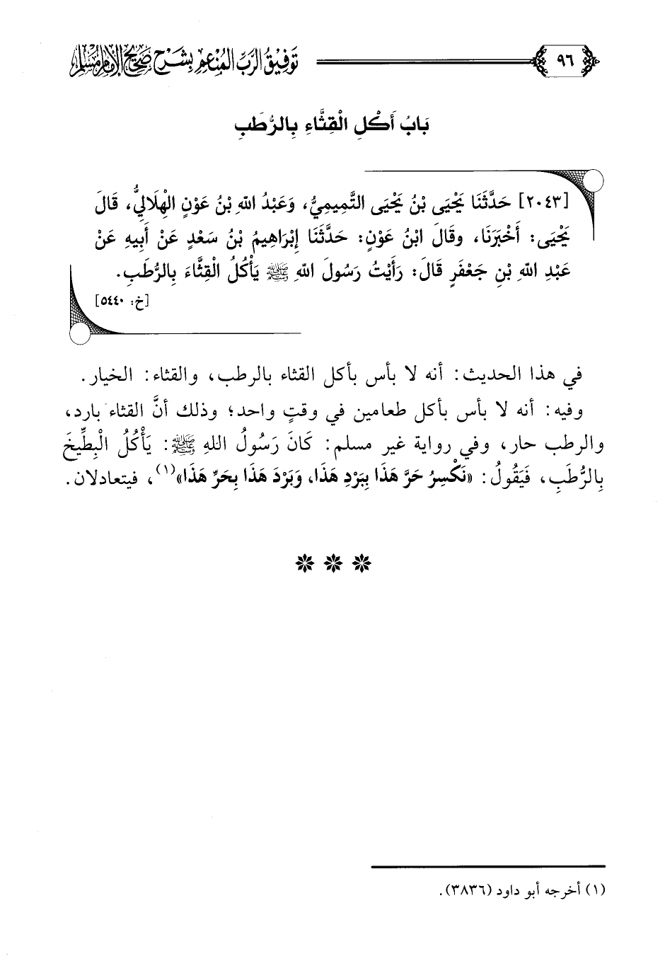 [٢٠٤٣] حَدَّثَنَا يَحْيَى بْنُ يَحْيَى التَّمِيمِيُّ، وَعَبْدُ اللَّهِ بْنُ عَوْنٍ الْهِلَالِيُّ، قَالَ يَحْيَى: أَخْبَرَنَا، وقَالَ ابْنُ عَوْنٍ: حَدَّثَنَا إِبْرَاهِيمُ بْنُ سَعْدٍ عَنْ أَبِيهِ عَنْ عَبْدِ اللَّهِ بْنِ جَعْفَرٍ قَالَ: رَأَيْتُ رَسُولَ اللَّهِ صلى الله عليه وسلم يَأْكُلُ الْقِثَّاءَ بِالرُّطَبِ.
