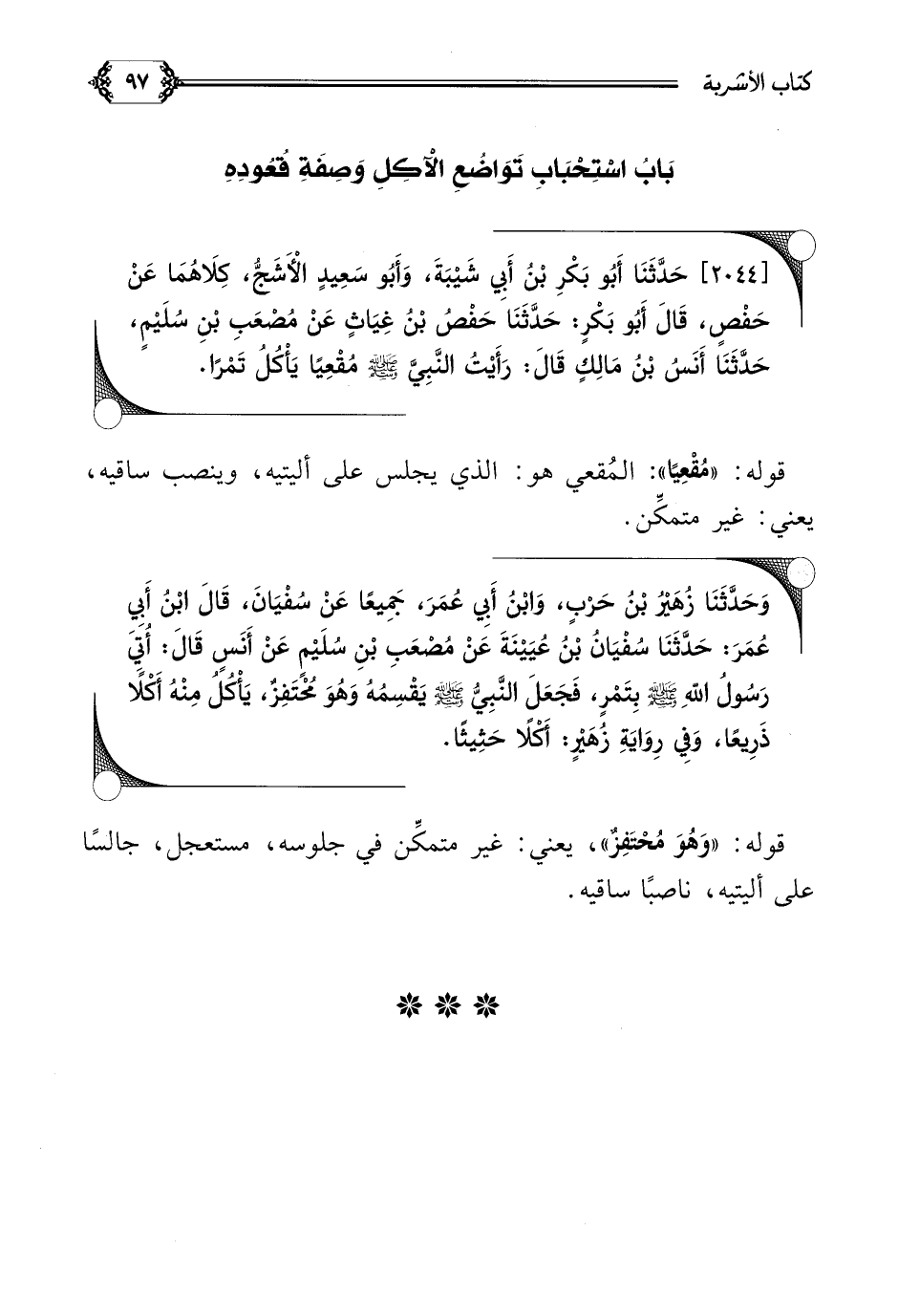 [٢٠٤٤] حَدَّثَنَا أَبُو بَكْرِ بْنُ أَبِي شَيْبَةَ، وَأَبُو سَعِيدٍ الْأَشَجُّ، كِلَاهُمَا عَنْ حَفْصٍ، قَالَ أَبُو بَكْرٍ: حَدَّثَنَا حَفْصُ بْنُ غِيَاثٍ عَنْ مُصْعَبِ بْنِ سُلَيْمٍ، حَدَّثَنَا أَنَسُ بْنُ مَالِكٍ قَالَ: رَأَيْتُ النَّبِيَّ صلى الله عليه وسلم مُقْعِيًا يَأْكُلُ تَمْرًا.