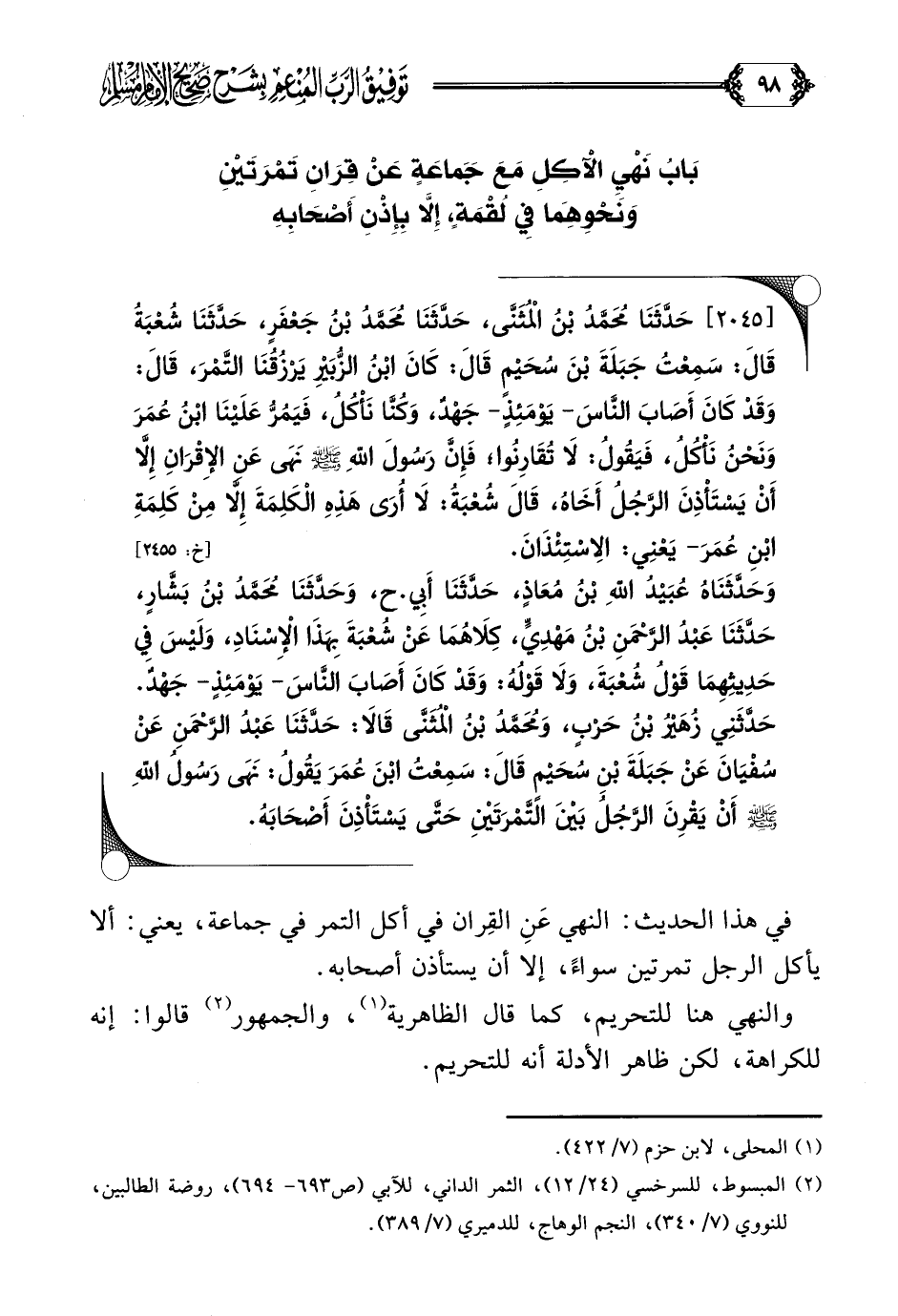 [٢٠٤٥] حَدَّثَنَا مُحَمَّدُ بْنُ الْمُثَنَّى، حَدَّثَنَا مُحَمَّدُ بْنُ جَعْفَرٍ، حَدَّثَنَا شُعْبَةُ قَالَ: سَمِعْتُ جَبَلَةَ بْنَ سُحَيْمٍ قَالَ: كَانَ ابْنُ الزُّبَيْرِ يَرْزُقُنَا التَّمْرَ، قَالَ: وَقَدْ كَانَ أَصَابَ النَّاسَ- يَوْمَئِذٍ- جَهْدٌ، وَكُنَّا نَأْكُلُ، فَيَمُرُّ عَلَيْنَا ابْنُ عُمَرَ وَنَحْنُ نَأْكُلُ، فَيَقُولُ: لَا تُقَارِنُوا؛ فَإِنَّ رَسُولَ اللَّهِ صلى الله عليه وسلم نَهَى عَنِ الإِقْرَانِ إِلَّا أَنْ يَسْتَأْذِنَ الرَّجُلُ أَخَاهُ، قَالَ شُعْبَةُ: لَا أُرَى هَذِهِ الْكَلِمَةَ إِلَّا مِنْ كَلِمَةِ ابْنِ عُمَرَ- يَعْنِي: الِاسْتِئْذَانَ.