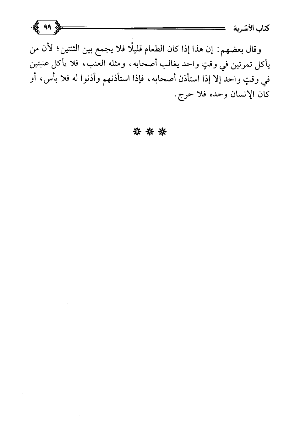 وقال بعضهم: إن هذا إذا كان الطعام قليلًا فلا يجمع بين الثنتين؛ لأن من يأكل تمرتين في وقتٍ واحد يغالب أصحابه، ومثله العنب، فلا يأكل عنبتين في وقتٍ واحد إلا إذا استأذن أصحابه، فإذا استأذنهم وأذنوا له فلا بأس، أو كان الإنسان وحده فلا حرج.