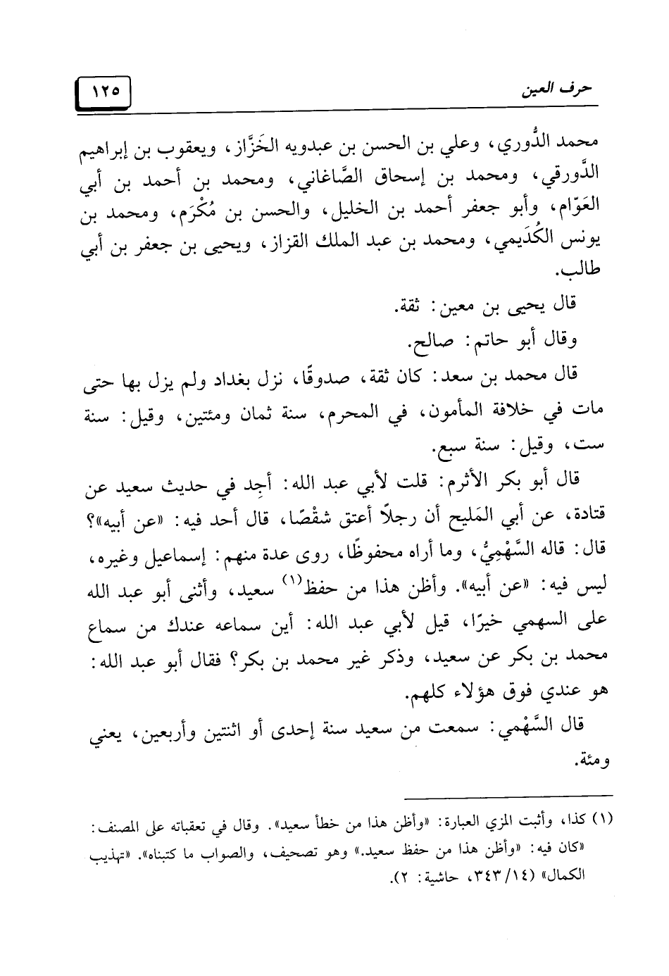(¬١) كذا، وأثبت المزي العبارة: "وأظن هذا من خطأ سعيد". وقال في تعقباته على المصنف: "كان فيه: "وأظن هذا من حفظ سعيد." وهو تصحيف، والصواب ما كتبناه". "تهذيب الكمال" (١٤/ ٣٤٣، حاشية: ٢)